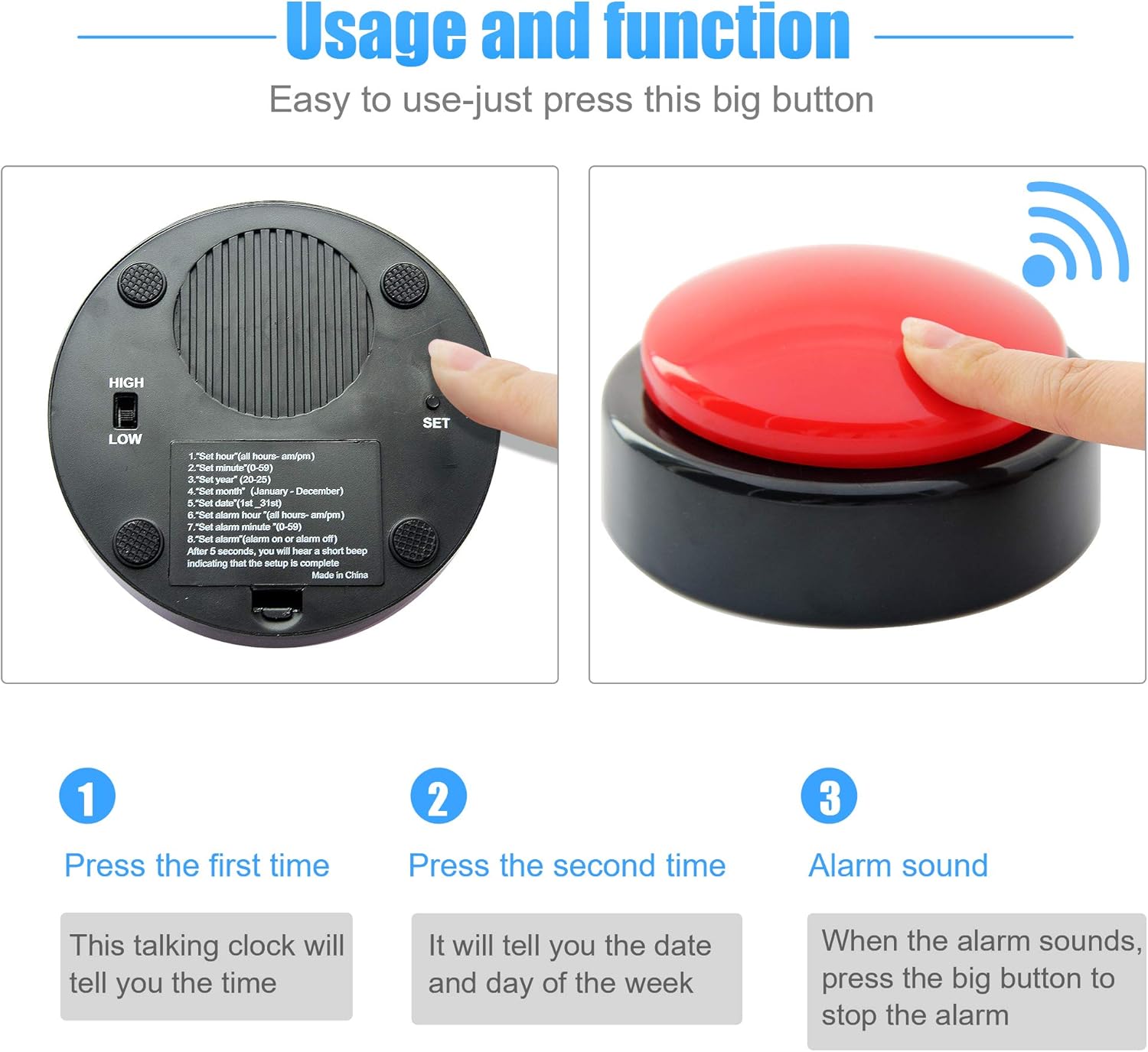 - ★How to Use : Just push the large button and this speaking clock will tell you the time, Push it a second time and it will tell you the date and day of the week. When the alarm sounds, push the large button to stop the sounding of the alarm.Two settings for voice in the bottom - High and Low.