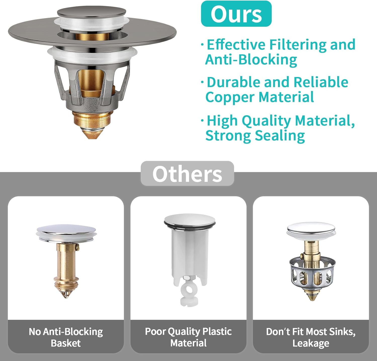 - [ Build-in Strainer ] The sink plug with an anti-blocking basket strainer inside which can collect hairs and prevent the drain from clogging up, achieving effective filtering, unlike regular push button drain. Suitable for bathtub, bathroom and kitchen sink, and so on.