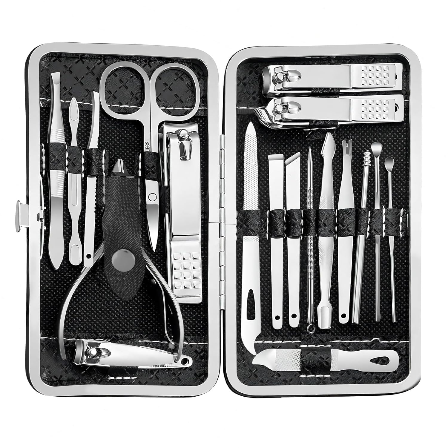 - * 19 Tools Optional - Featuring sturdy stainless steel professional manicure kit, is your one-stop solution for nails, pedicure, facial, and grooming needs. The pedicure kit set includes everything from nail clippers to tweezers, cuticle cutters, and even nose hair scissors, saving you the cost of individual purchases. The nail clipper kit ability to easily handle thick nails demonstrates its efficiency and strength.
