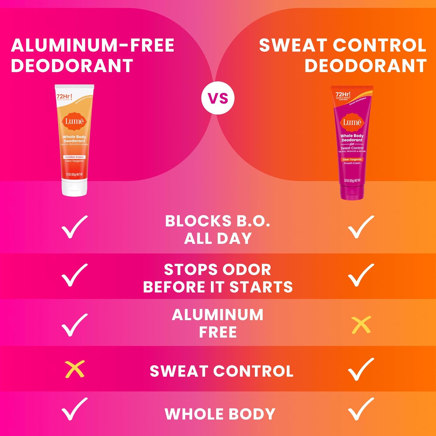 Lume Whole Body Deodorant Plus Sweat Control - Smooth Cream Tube - 72 Hour Odor And Sweat Control - Baking Soda Free, Skin Loving - 3.0 ounce (Pack of 2) (Clean Tangerine)