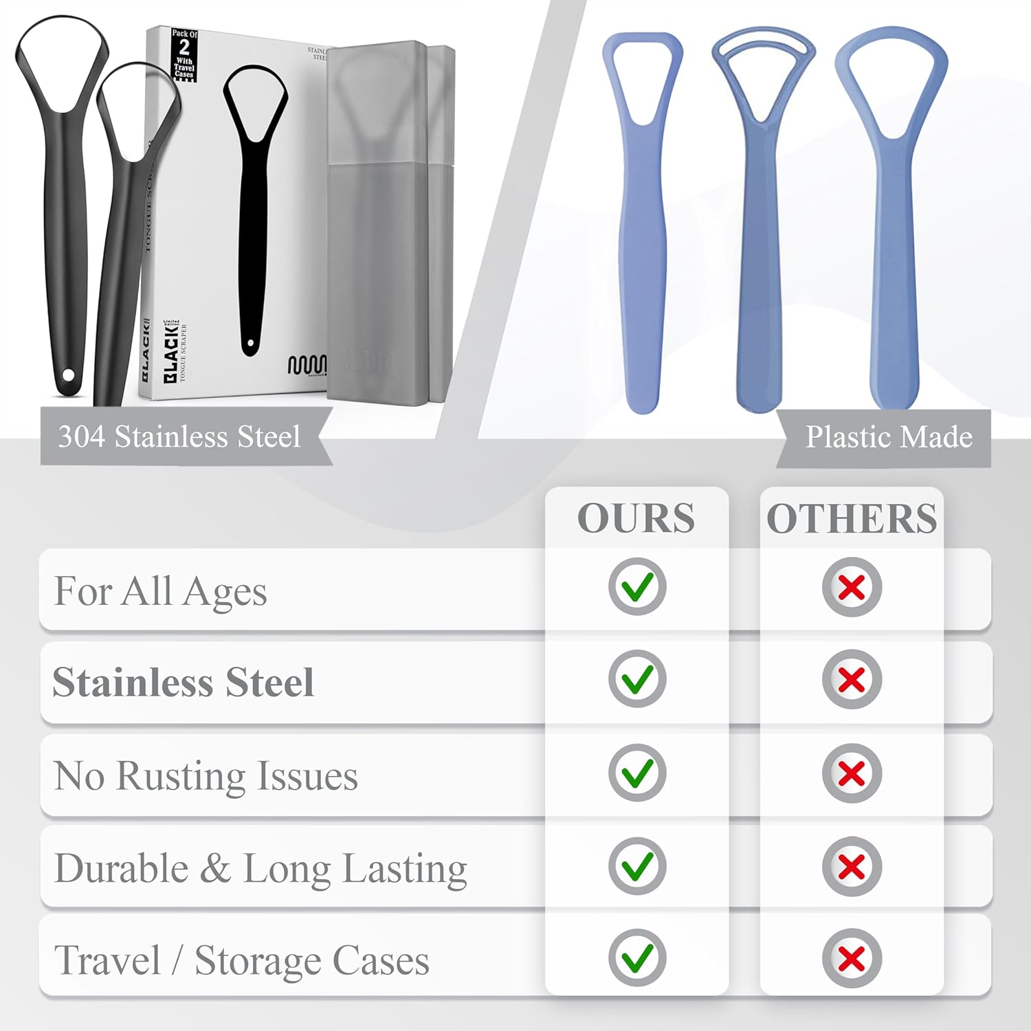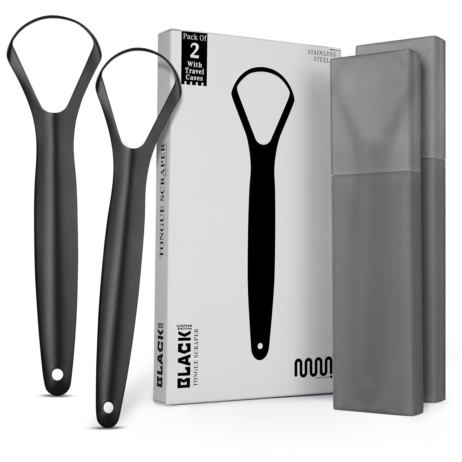 MasterMedi Black Tongue Scraper with Cases (Spoon Shape, 2 Pack), Tongue Scrubber for Bad Breath Treatment, Easy to Use Tongue Scraper for Adults, Tongue Cleaner for Oral Care