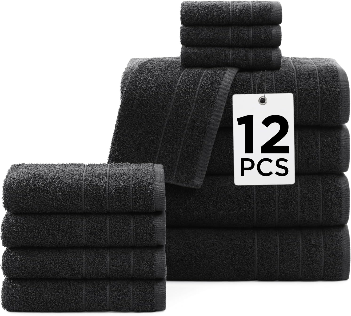 Casa Platino 100% Mercerized Cotton Luxury Bathroom Towels Set - 12 Piece - Ring Spun Technology - 4 Bath, 4 Washcloths, 4 Hand Towels - Remains Soft & Absorbent Even After Multiple Washes - Black