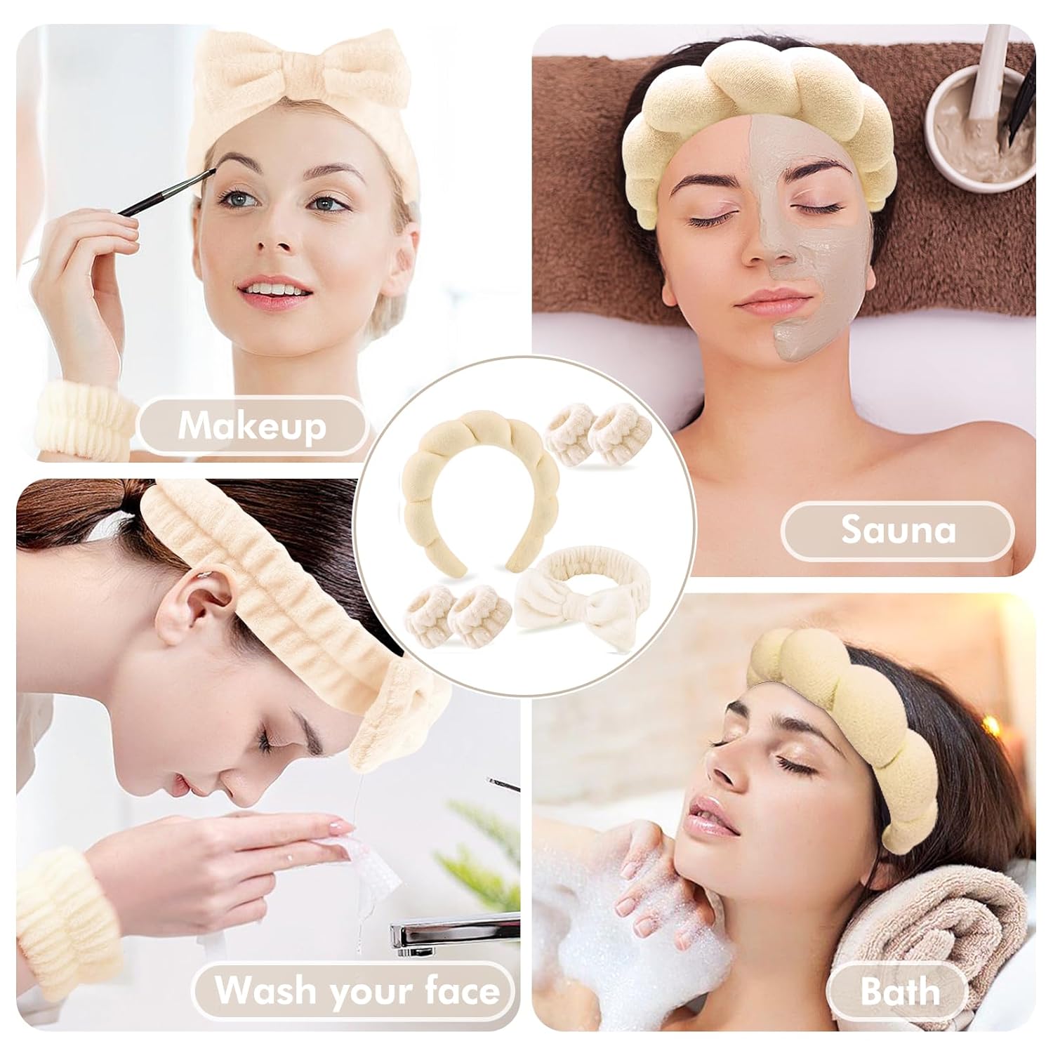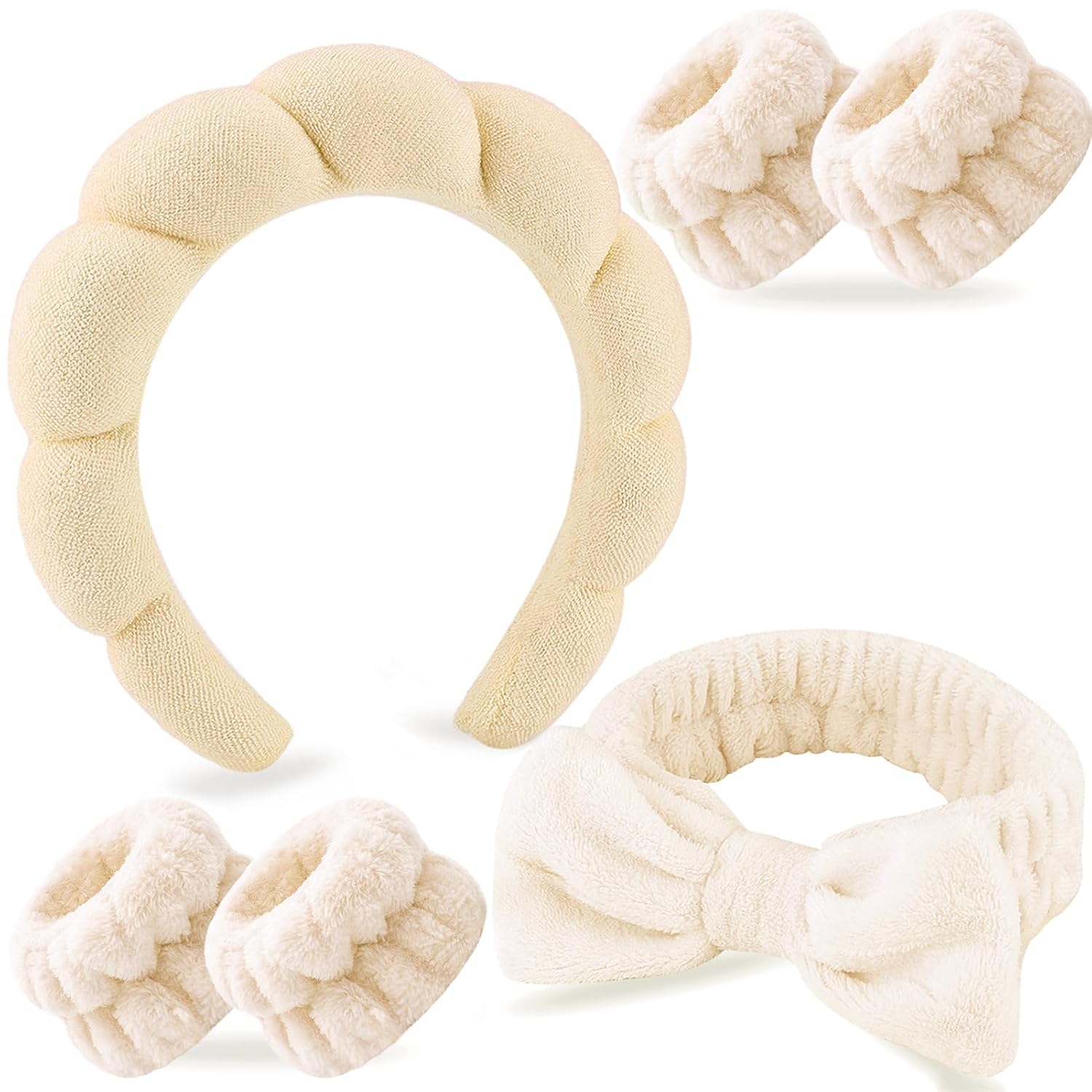 Zkptops 6Pcs Spa Headband for Washing Face Wristband Set Sponge Makeup Skincare Terry Cloth Headband Bubble Soft Get Ready Hairband Women Puffy Padded Headwear Non Slip Hair Accessory(Beige)