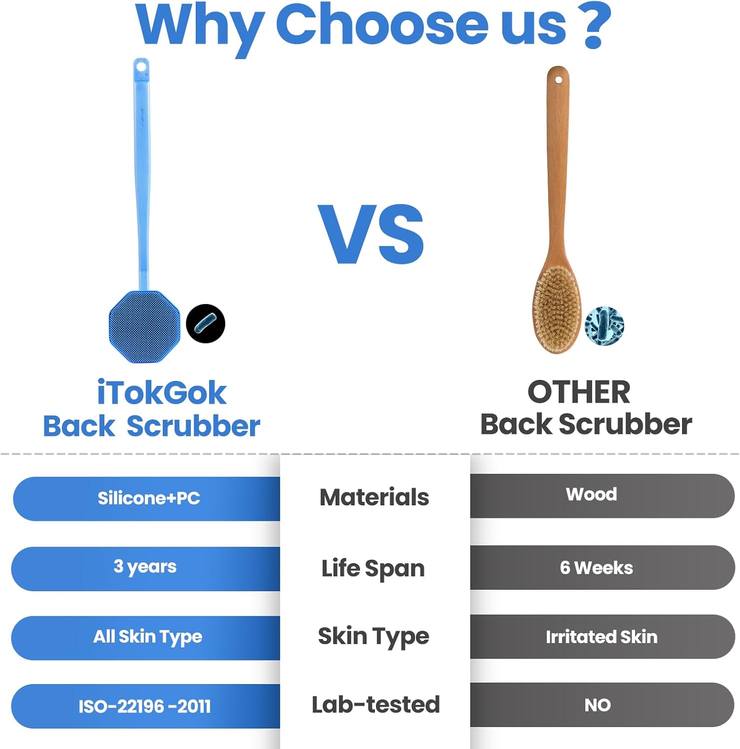 - ISO-22196 -2011 Test : iTokGok Long Handle Silicone Back Scrubber Infused "Micro-KF113 silver" ,Tests Displayed An Efficacy Rate Exceeding 99.9%.