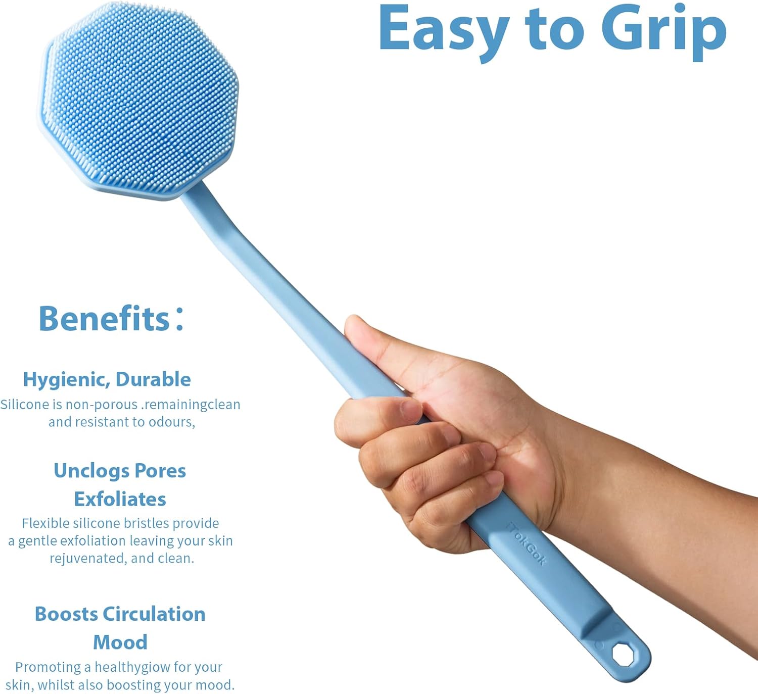 iTokGoK® Silver-Infused Silicone Back Scrubber with Long Handle Back Brush for Shower,Back Brush Long Handle for Men and Women,Ergonomic No-Slip Handle, Long-Lasting (Sky Blue)