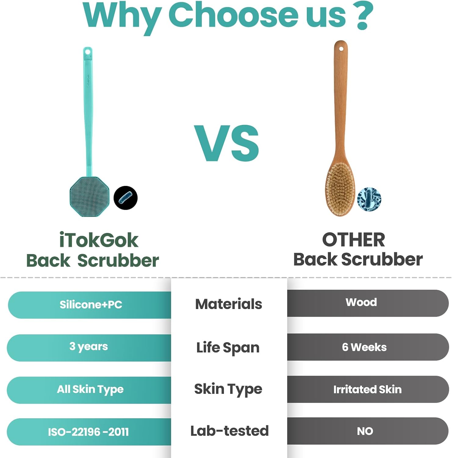 - ISO-22196 -2011 Test : iTokGok Long Handle Silicone Back Scrubber Infused "Micro-KF113 silver" ,Tests Displayed An Efficacy Rate Exceeding 99.9%.