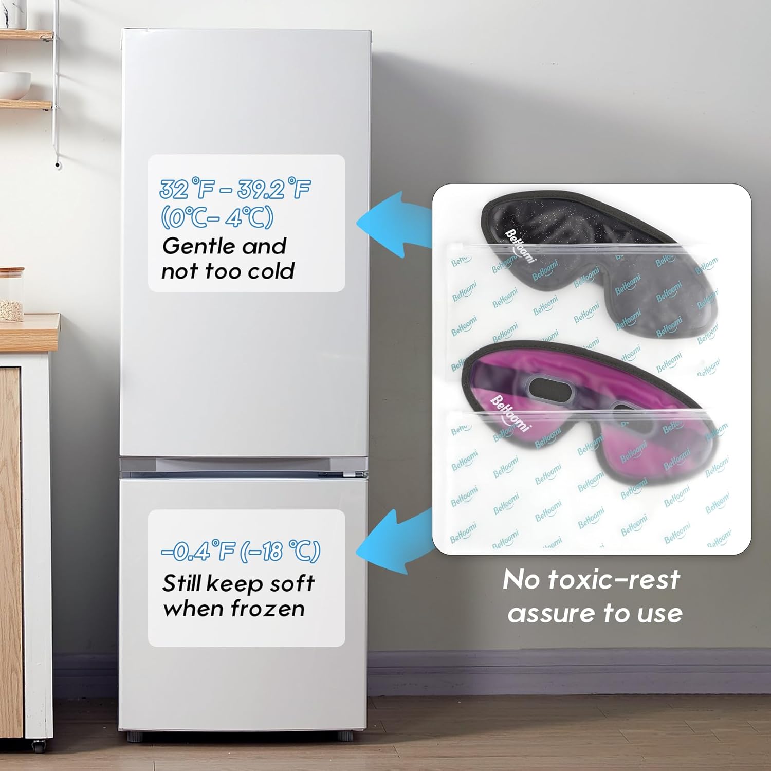 - Ergonomic Deepened Nose Fit: The BeHoomi cooling eye masks is designed with a deepened nose fit, preventing discomfort on the bridge of the nose when wearing the ice eye mask. Its large surface area better fits around your eyes. Cold compress for eyes refresh eyes when needed most and promoting relaxation and energy.