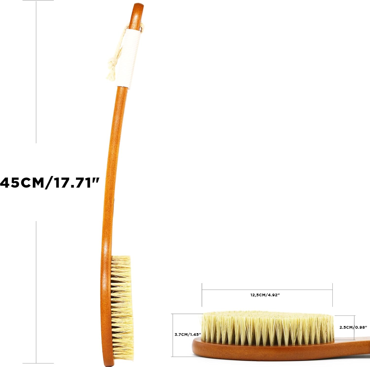- Can't reach your back?: ICANdOIT Shower Brush has a Bent&Long handle made of Bamboo that is around 45 cm (17.71 inch) long, it can be reached and washed your whole back even all parts of the body easily,it is also easy to hold. In addition, there is a non-slip Soft touch Silicon grip and a hanging rope at the handle.