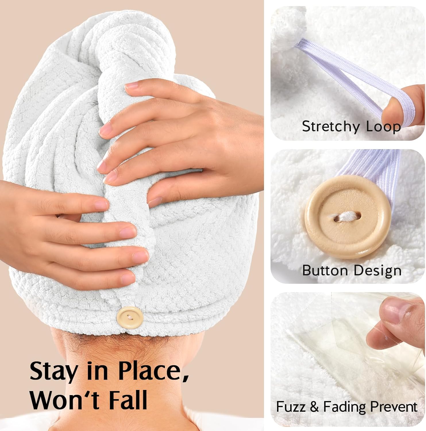 YFONG 2 Pack Microfiber Hair Towel Wrap for Women, Super Absorbent Quick Dry Hair Turban for All Hair Style Anti Frizz, Large Hair Drying Towel with Button