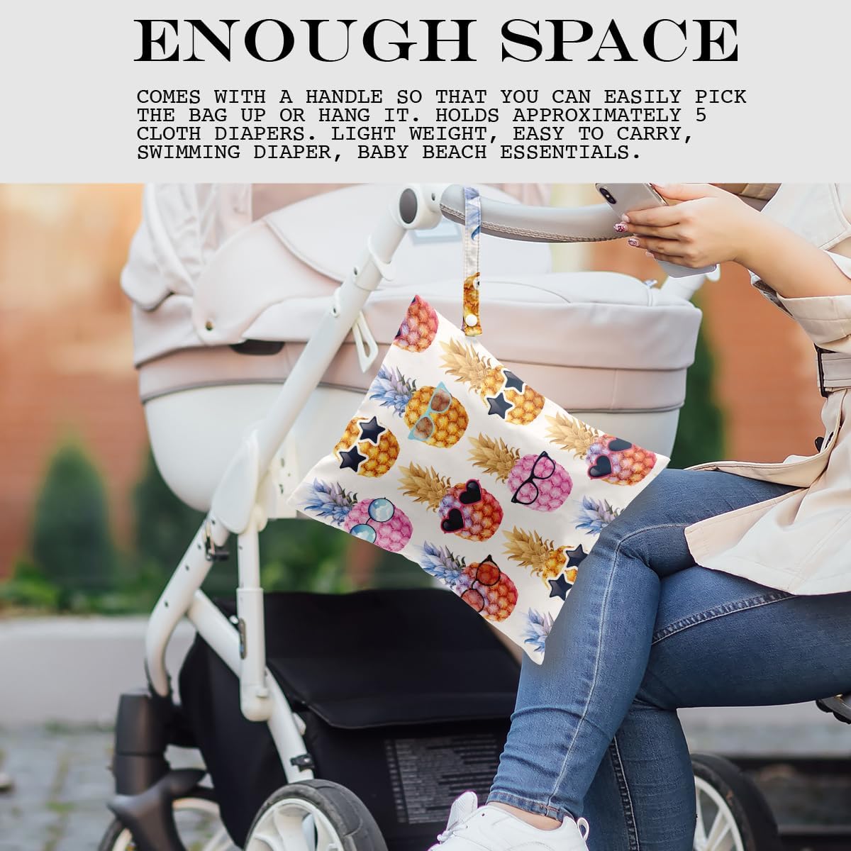 • ENOUGH SPACE - 26cm x 32cm (approx.: 12.5” x 10.2”). Comes with a handle so that you can easily pick the bag up or hang it. Holds approximately 5 cloth diapers. Light weight, easy to carry, swimming diaper, beach essentials.