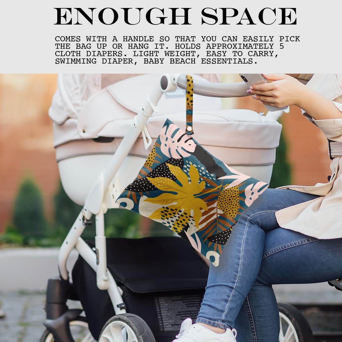 • ENOUGH SPACE - 26cm x 32cm (approx.: 12.5” x 10.2”). Comes with a handle so that you can easily pick the bag up or hang it. Holds approximately 5 cloth diapers. Light weight, easy to carry, swimming diaper, beach essentials.