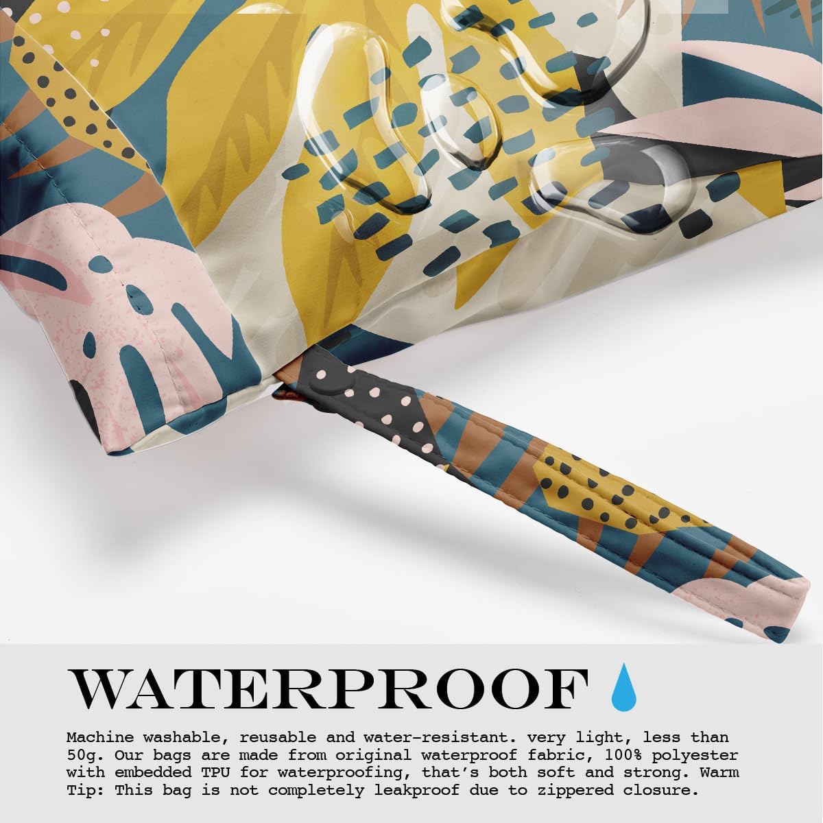 • WATERPROOF - Machine washable, reusable and water-resistant. very light, less than 50g. Our bags are made from original waterproof fabric, 100% polyester with embedded TPU for waterproofing, that’s both soft and strong. Warm Tip: This bag is not completely leakproof due to zippered closure.