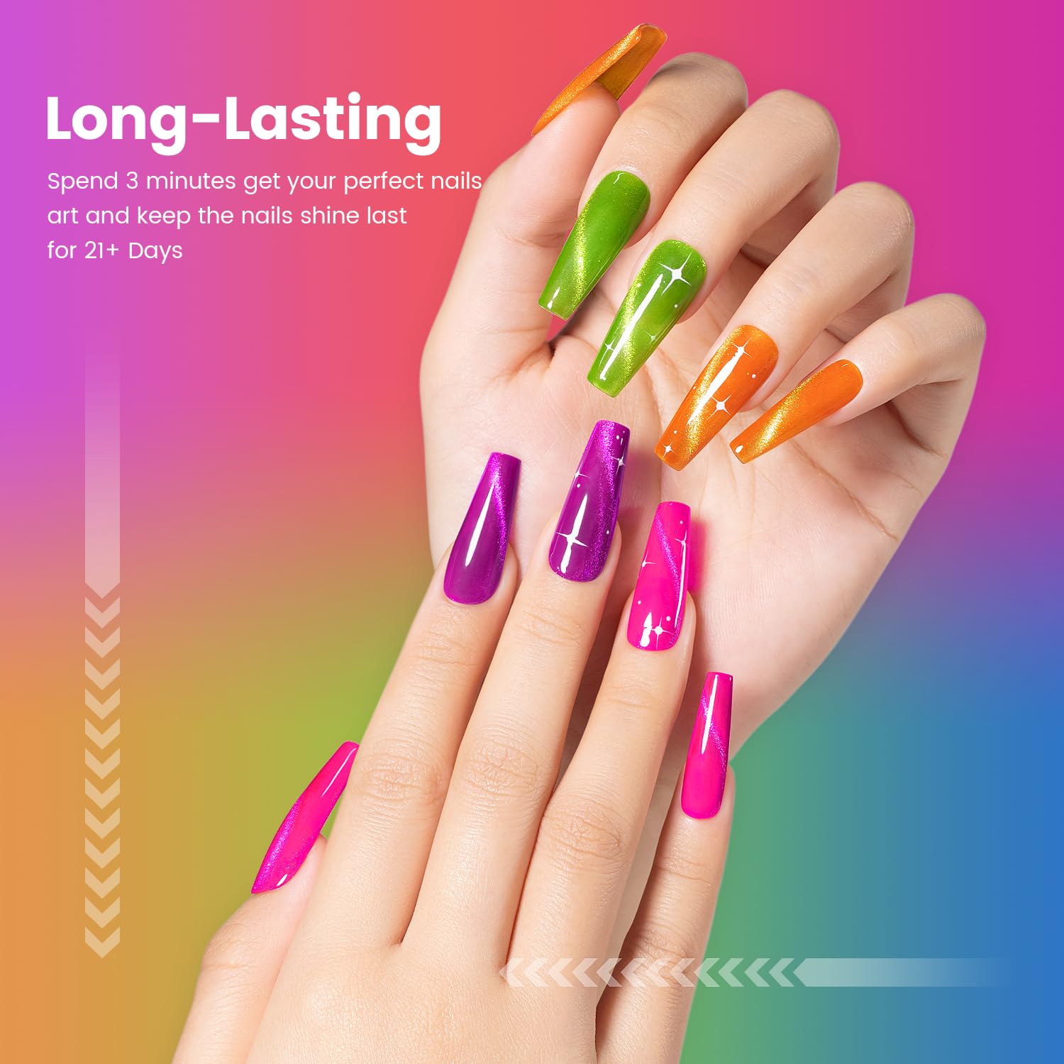 - BRIGHT NEON CAT EYE:Neon color cat eye gel nail polish is a truly dreamy effect that reflects light in the same way a crushed velvet texture might. Made with fine magnetic shimmers and cateye glitter pigments, our six new shades create optical nail lesions that move with every angle. Velvet cat eye nails are trending for this coming summer