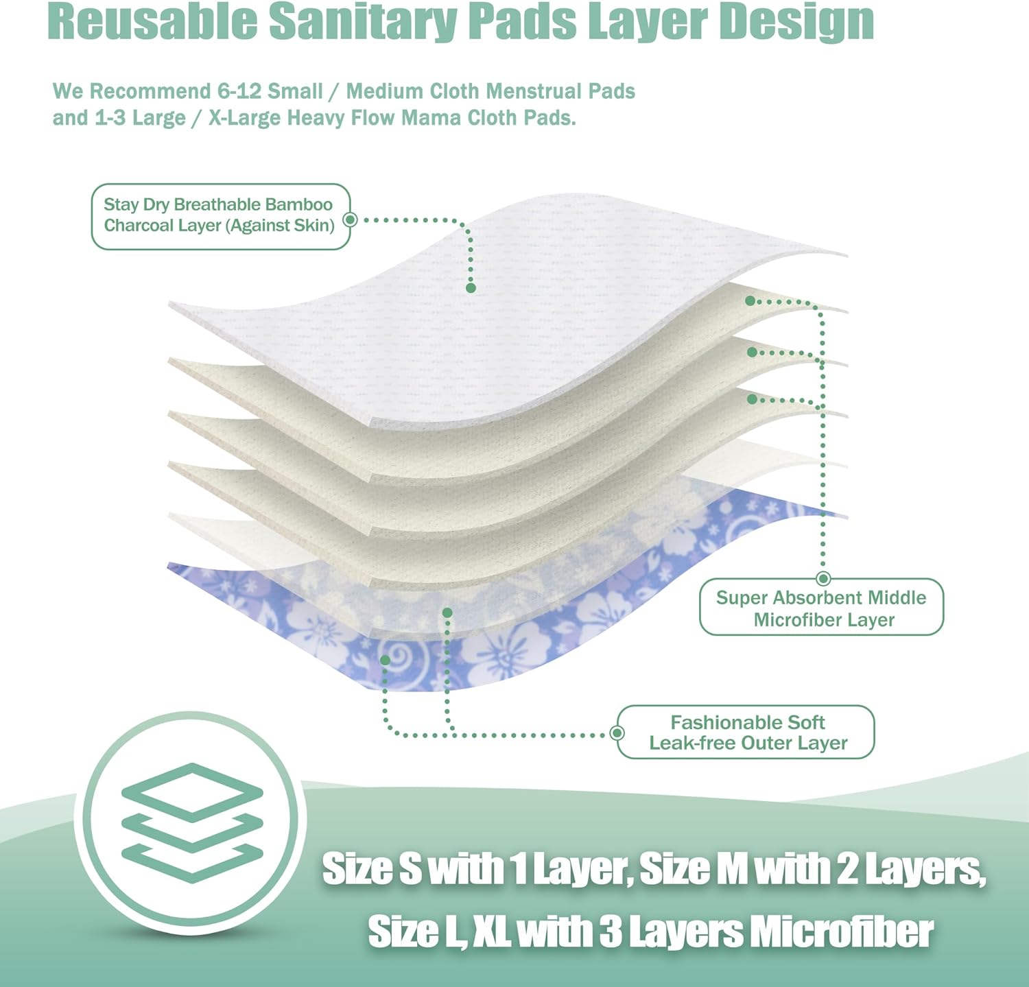 - LOVELY PRINT leak-free outer of Cloth Sanitary Napkin and comfort of the softer, charcoal layer against you. Great as period panties too.Fold over and snap into place.Never feel embarrassing