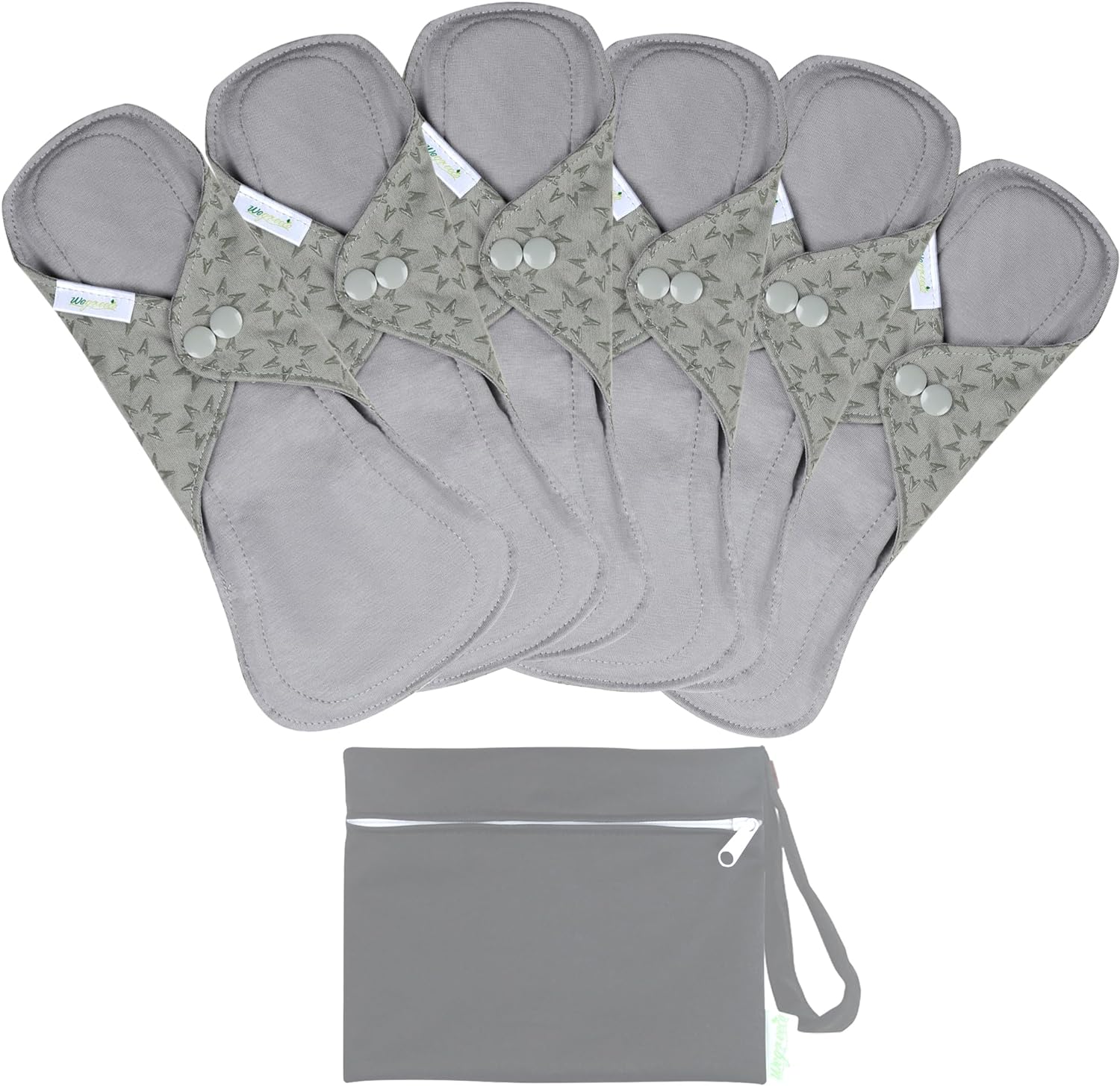 wegreeco 6 Pcs Reusable Menstrual Pads, Ultra Absorbent Cloth Pads for Heavy Flow, Sanitary for Teens,Women, Nonslip, Grey Inner, Grey Outer, Large
