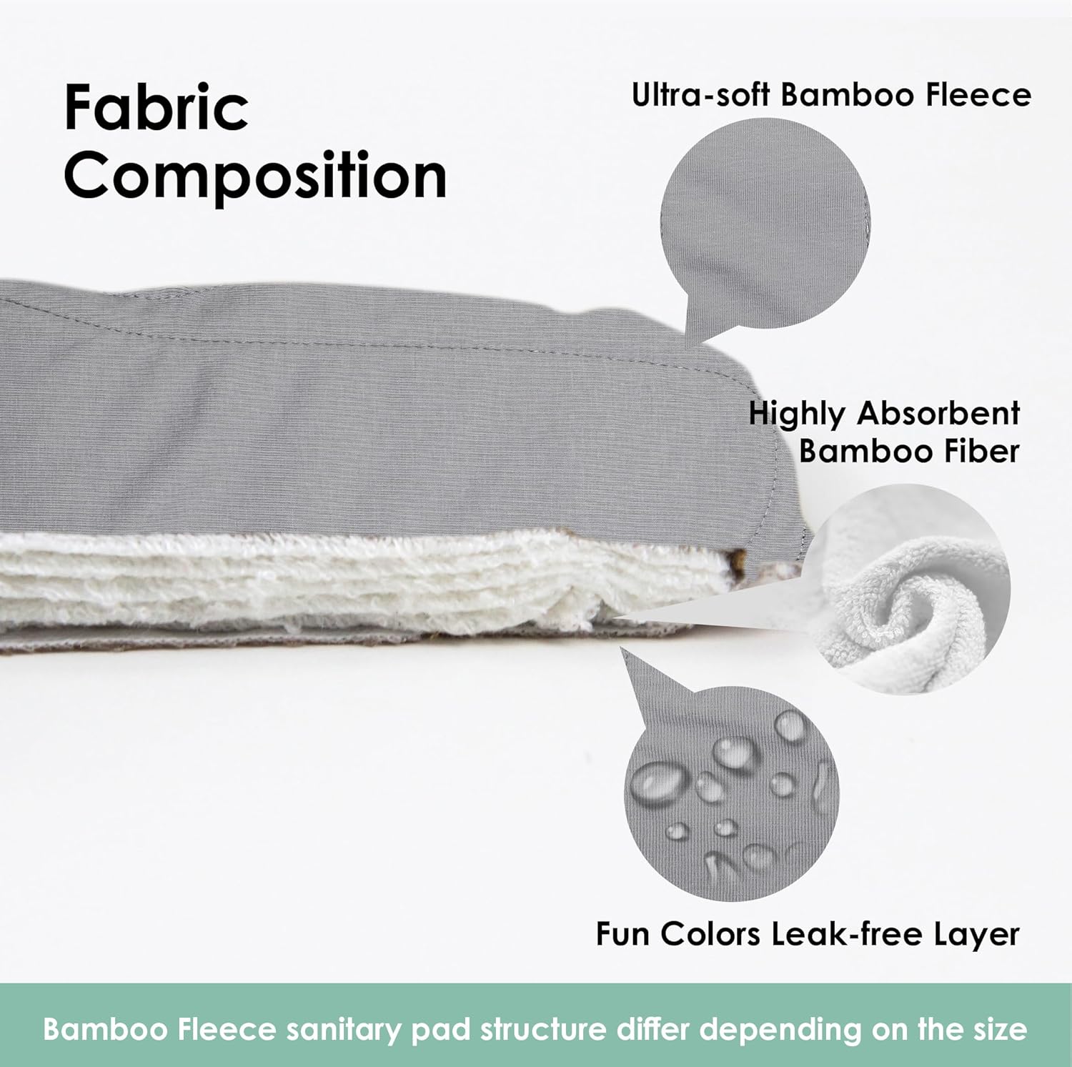 - Breathable Layer: Cloth panty liners structure differ depending on the size. Menstrual cloth pads Inner layer is ultra-soft fleece which lays against your skin, moistures wicking, and neutralizes odor. Lining layer is super-absorbent, and different sizes the layers are different. Outshell layer is leak-free TPU with backside silicon dot. The soft and gentle reusable sanitary pads offer great coverage and absorbency to keep you from leaks and spills.