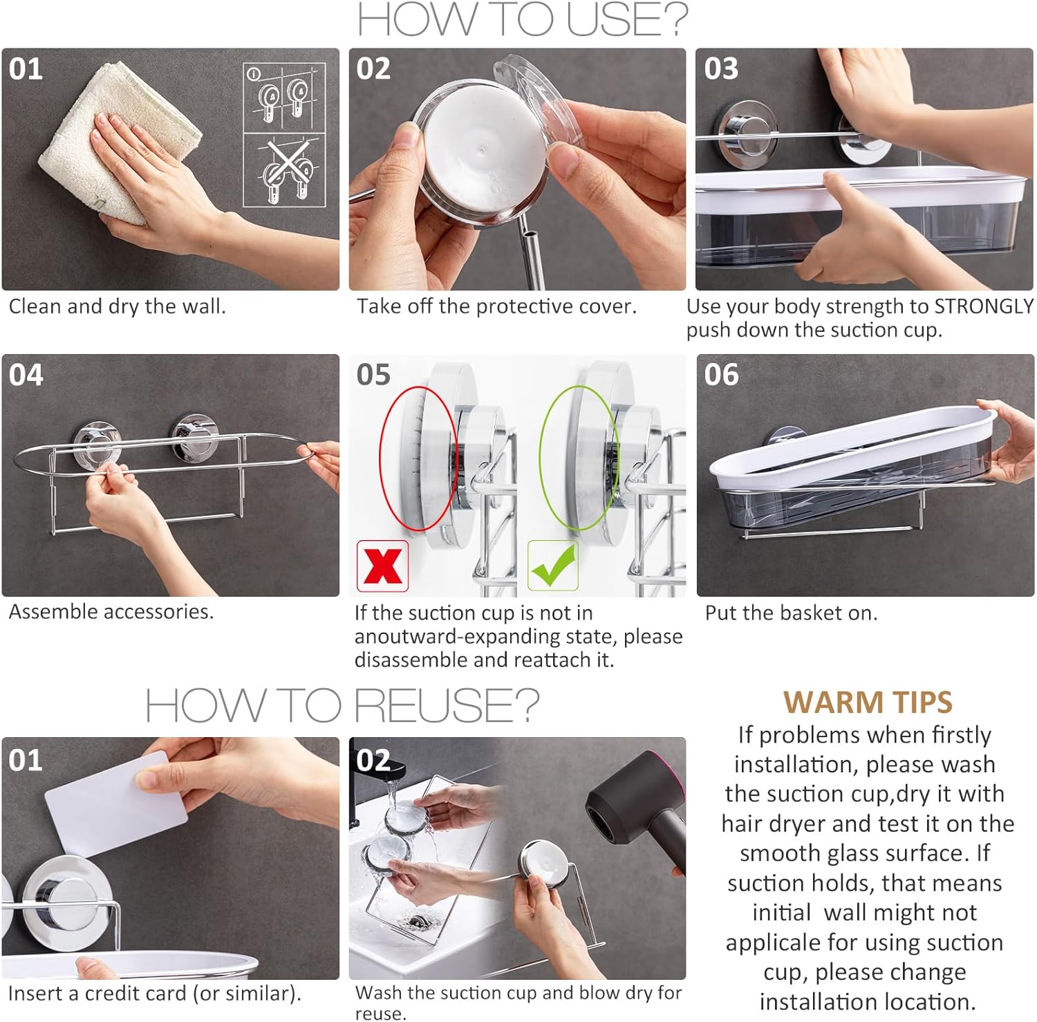- CORROSION RESISTANT - The shower shelf suction is applied with rustproof chrome-plated bracket. Non-fading, scratch-resistant and durable. You can take the bathroom organizer out whenever you need. Detachable design makes suction shower caddy cleaning easier