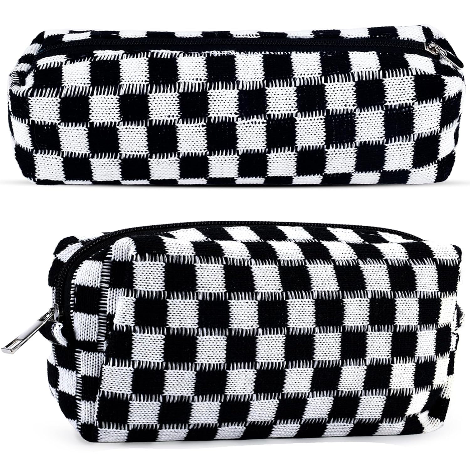 - LIGHT WEIGHT AND EXCELLENT WORKMANSHIP: The cute makeup pouch is made of soft knitted fabric and is comfortable, soft and lightweight. Checkered travel make up bag folds up when not in use and fits in a large bag without taking up space. The metal zipper of the cute pencil case keep your items secure and organized inside. Cosmetic bag accessories set for women