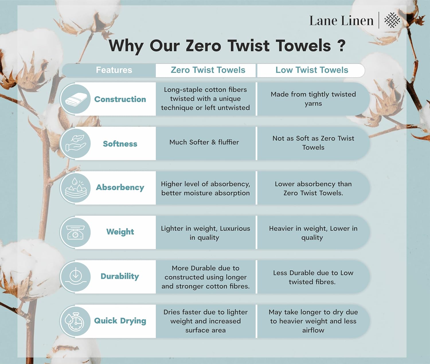 - Zero Twists: The absence of twists in the fibers allows for a smoother surface, making our towels exceptionally soft and smooth against the skin. Additionally, it provides excellent absorbency & drying capabilities, quickly wicking away moisture to keep you dry and comfortable.
