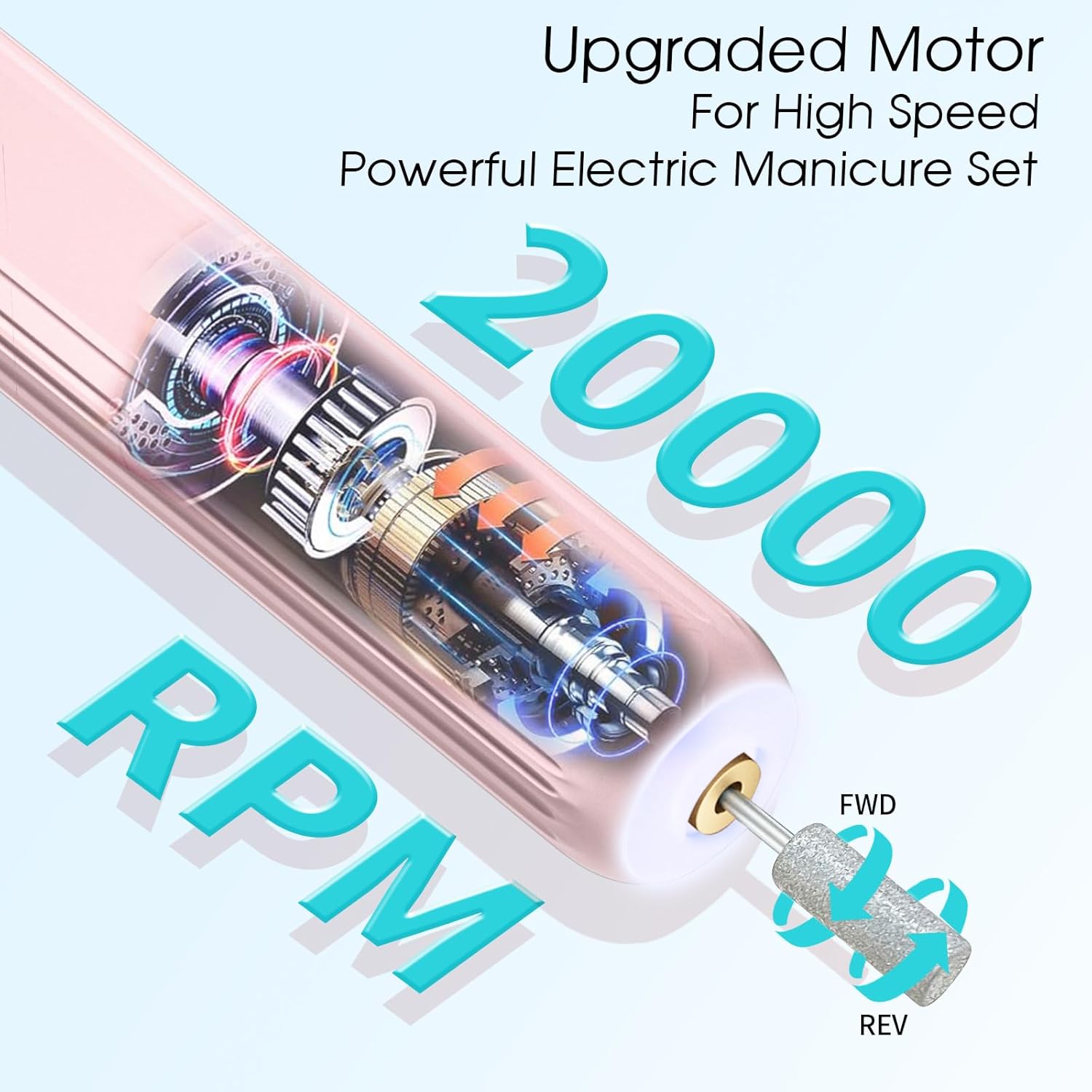 - Easy to use, Even for Beginner: This electric manicure pedicure kit have 3 adjustable speed 0-20,000rpm and designed with forward and reverse rotation directions,choose the appropriate speed and rotation for your needs; ergonomic body design for comfortable holding, speed and direction controlling. Easy to use, enjoy a salon-quality professional manicure pedicure at home. EVEN BEGINNERS CAN USE THIS ELECTRIC NAIL FILE WITH EASE !