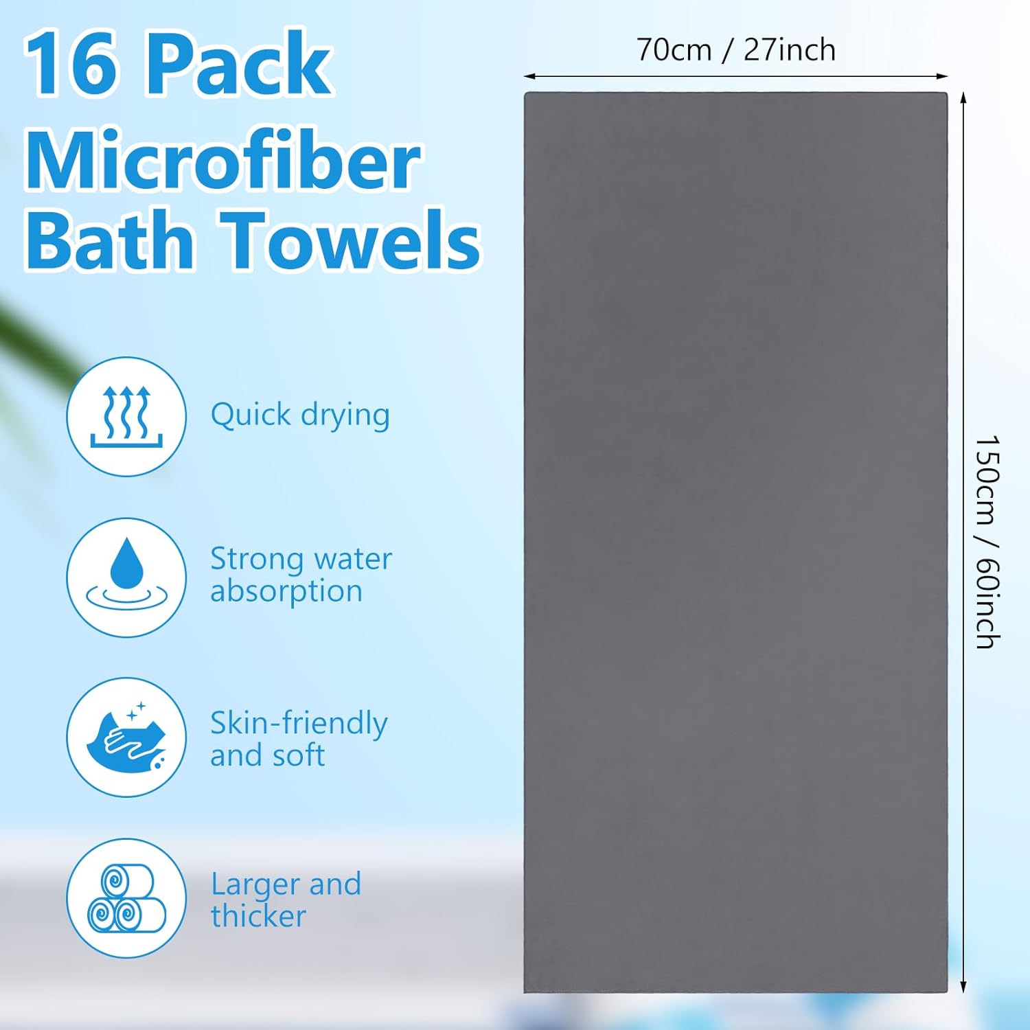 16 Pack Microfiber Bath Towels Bulk 27'' x 60'' Oversized Size Bath Towel Highly Absorbent Extra Large Soft Drying for Shower Beach Salon Winter Sport Spa Gym (Simple,Dark Gray)