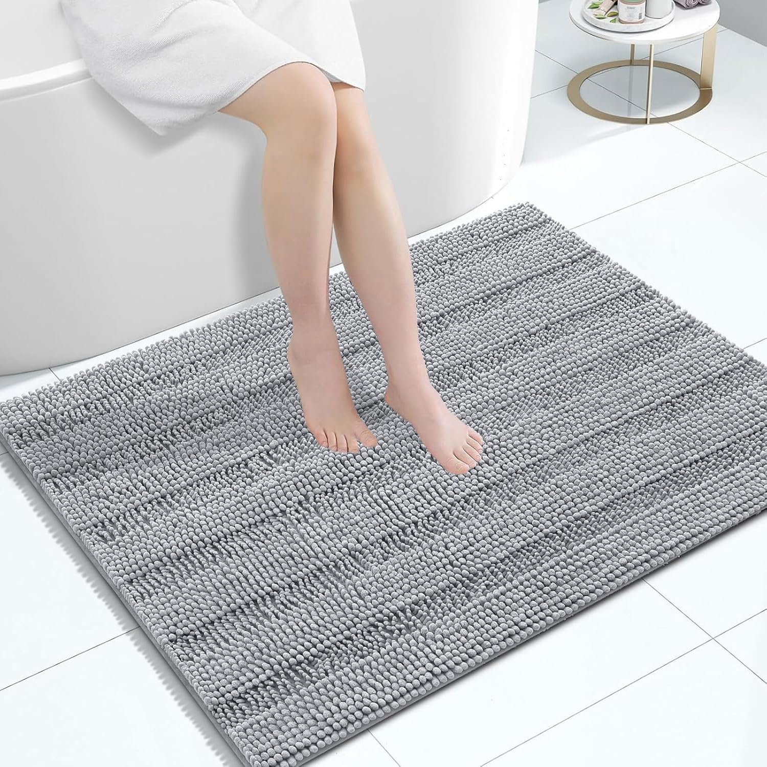 - [Superior Absorbency] Grandaily presents an absorbent bath rug crafted with dense chenille, ensuring your bathroom stays clean and dry. Step out of the bath or shower and instantly dry your feet on this shaggy rug, preventing water damage to your floor. The mat's deep piles effectively trap moisture, allowing for a quick and neat drying process.