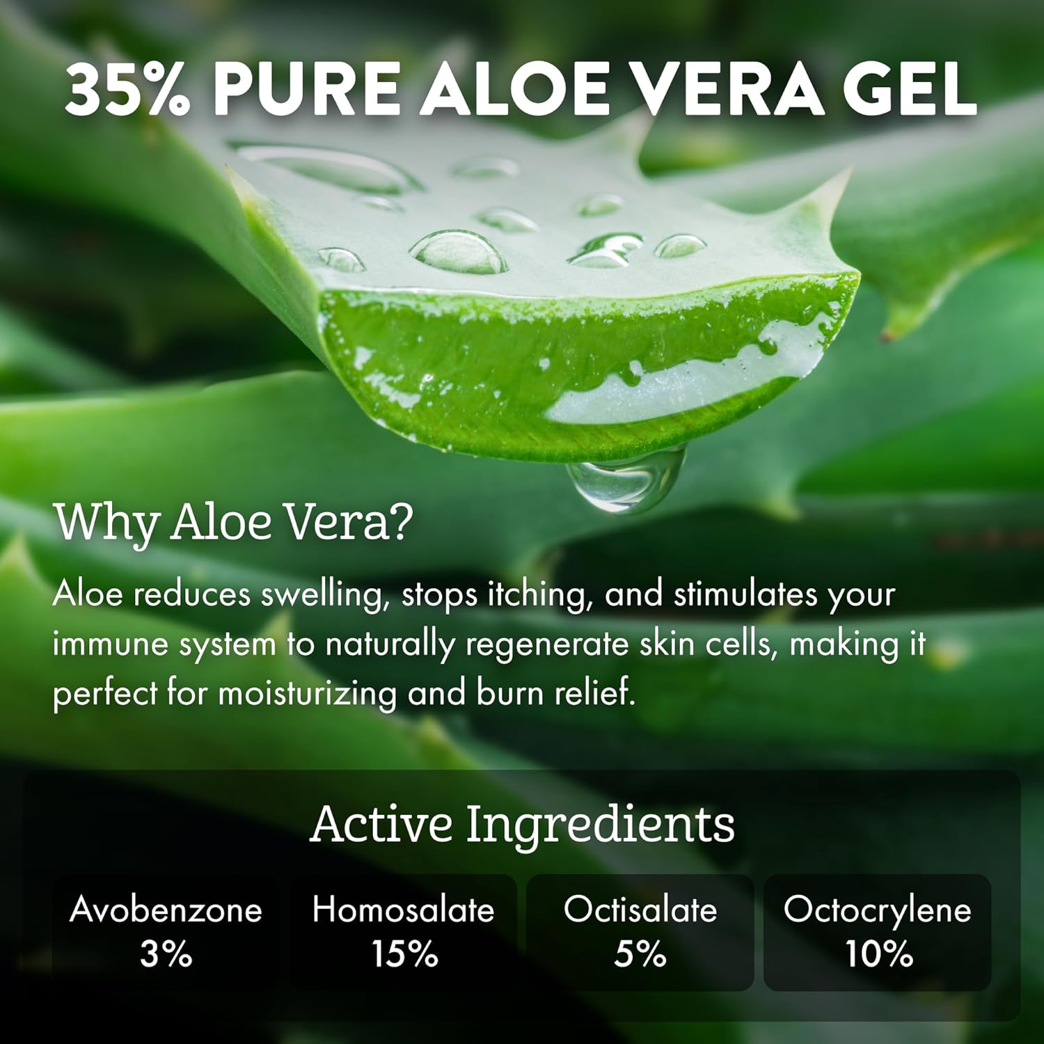 - NATURAL CUTTING-EDGE INGREDIENTS: Our carefully curated formula is based with 35% pure aloe vera gel for a hydrating suncare experience. It goes on light and absorbs quickly, leaving no greasy residue on your hands, skin, or gear. It is water-resistant for up to 80 minutes.