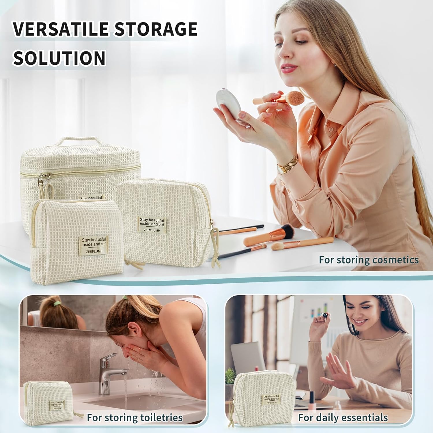 Cute Quilted Floral Makeup Bag(3Pcs),Coquette Aesthetic Cosmetic Bag,Travel Toiletry Bags, Kawaii Aesthetic pouch for Women (91 - Beige)