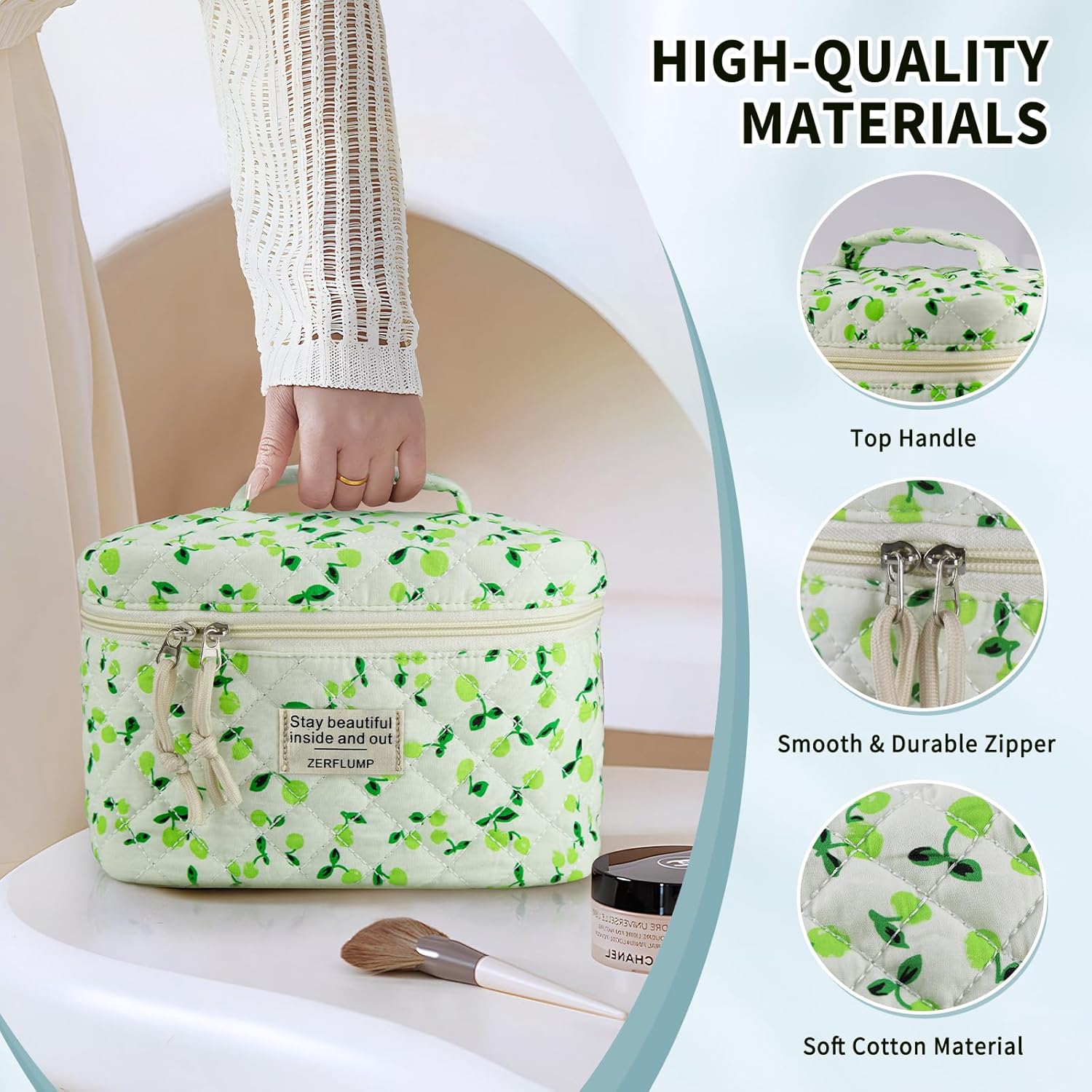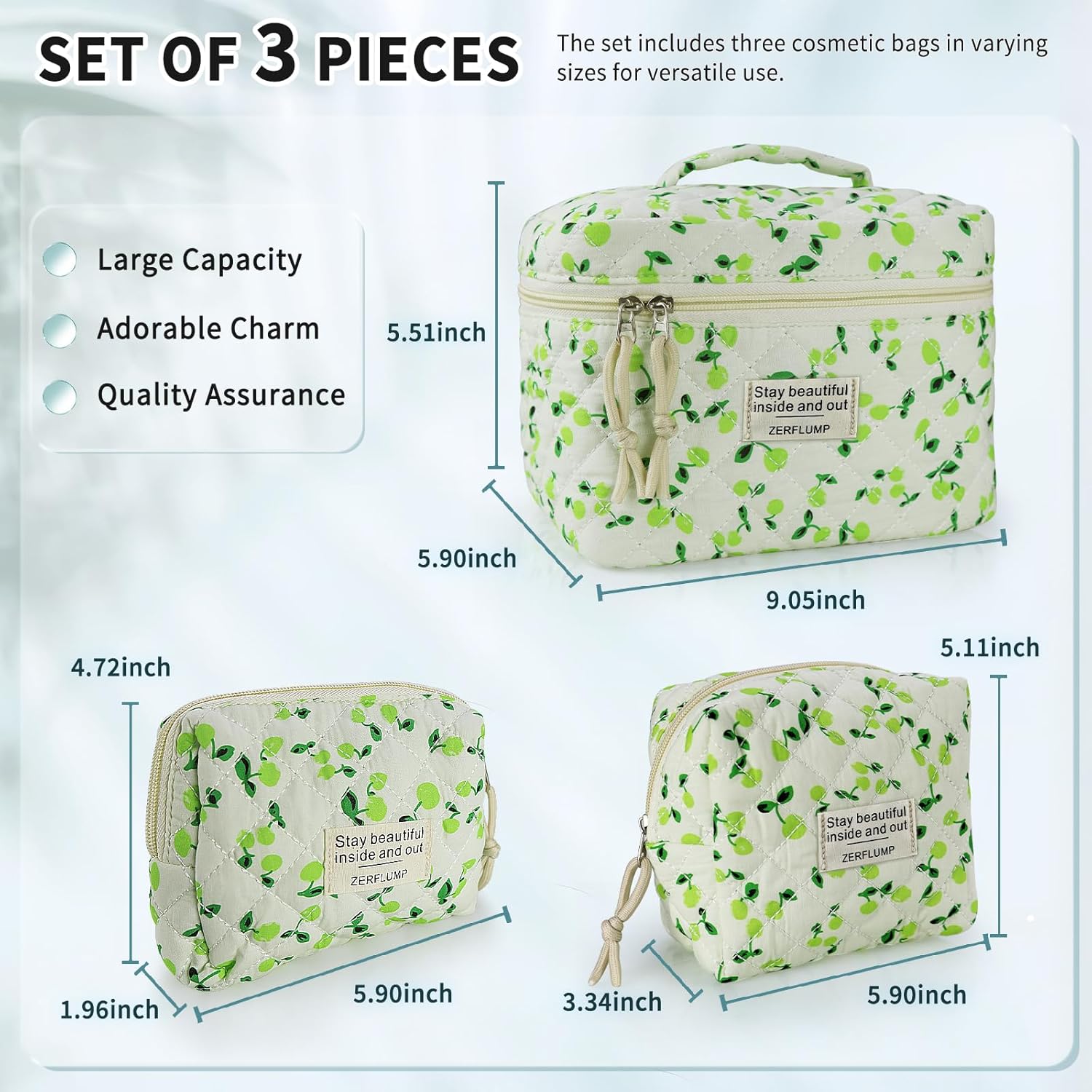Cute Quilted Floral Makeup Bag(3Pcs),Coquette Aesthetic Cosmetic Bag,Travel Toiletry Bags, Kawaii Aesthetic pouch for Women (6 - Green Fruit)