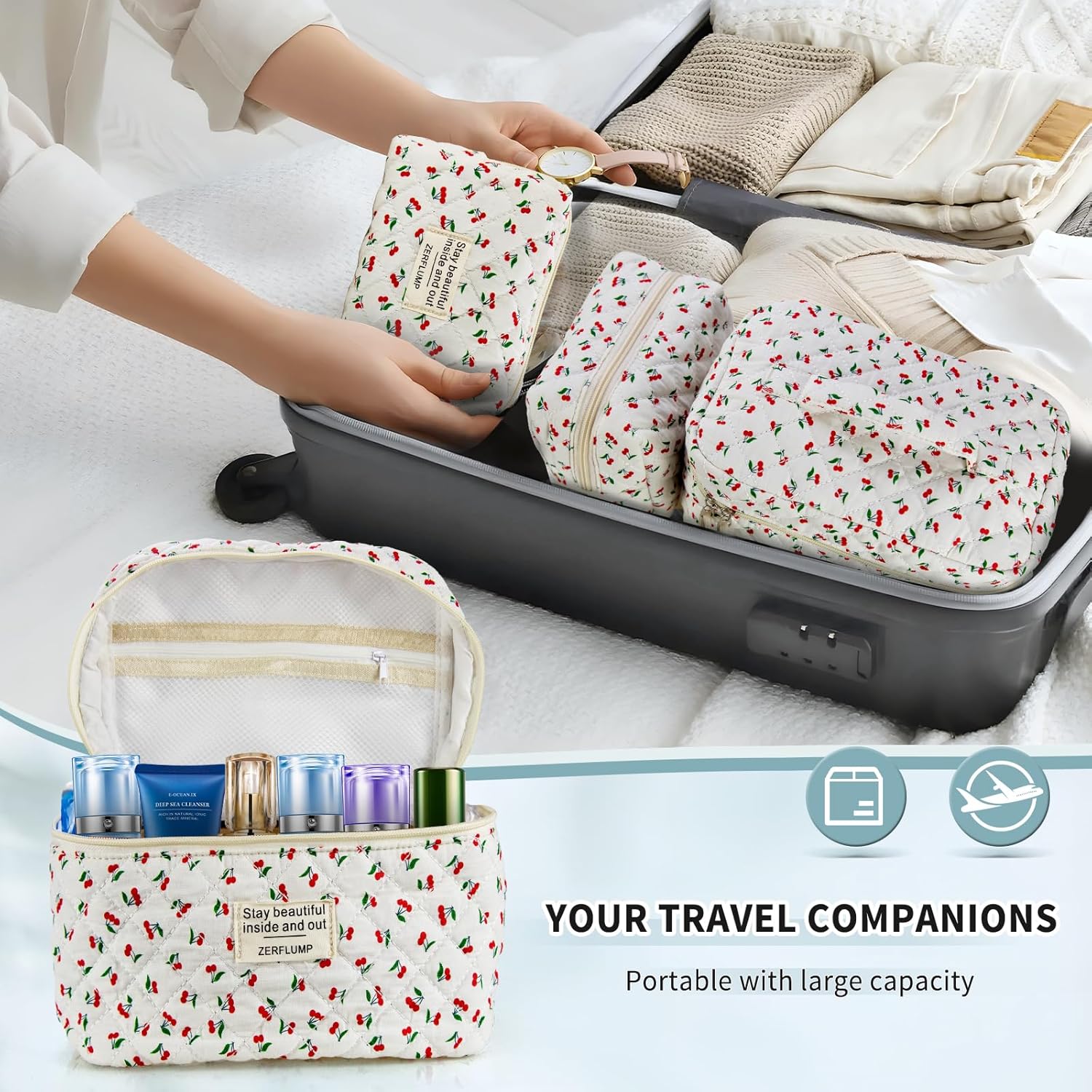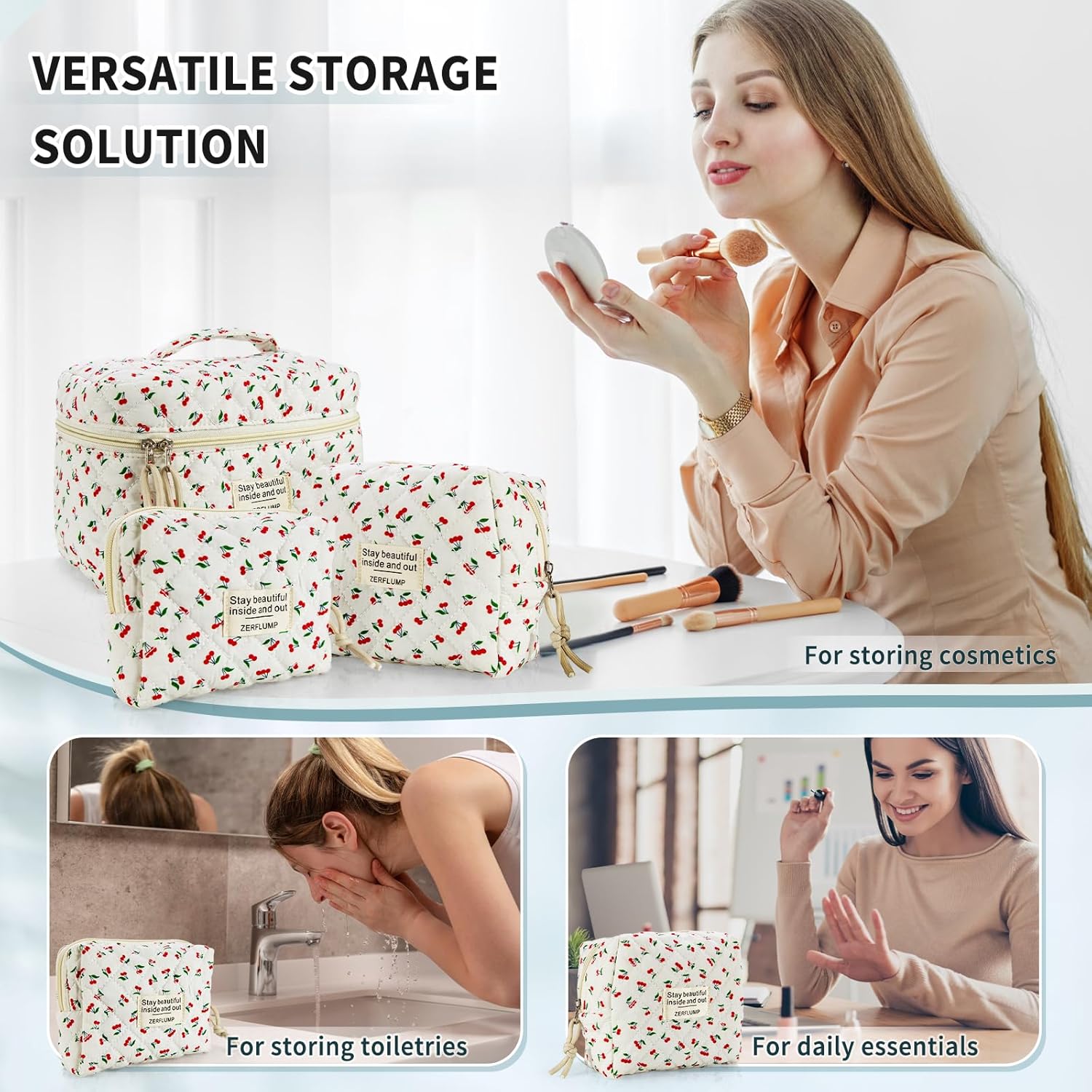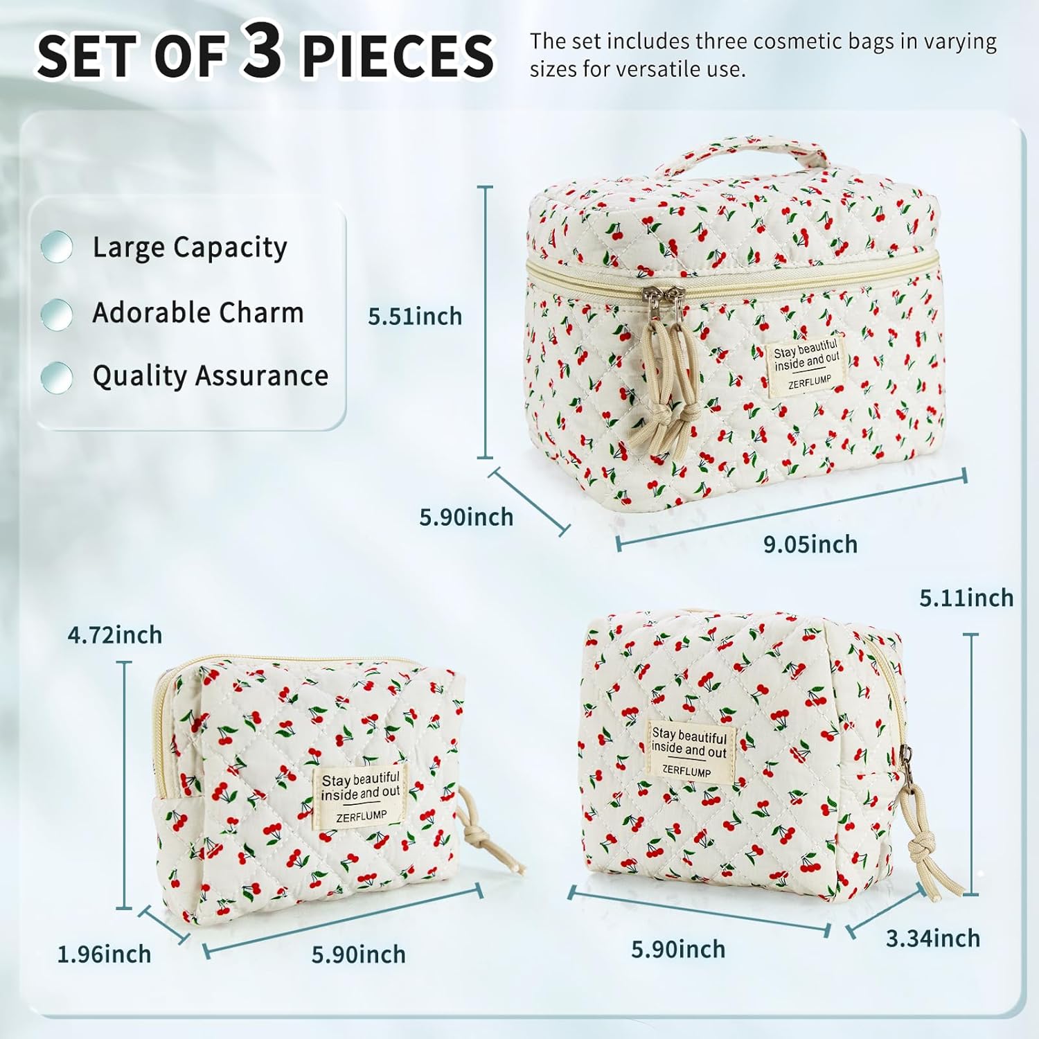 Cute Quilted Floral Makeup Bag(3Pcs),Coquette Aesthetic Cosmetic Bag,Travel Toiletry Bags, Kawaii Aesthetic pouch for Women (5 - Cherry)