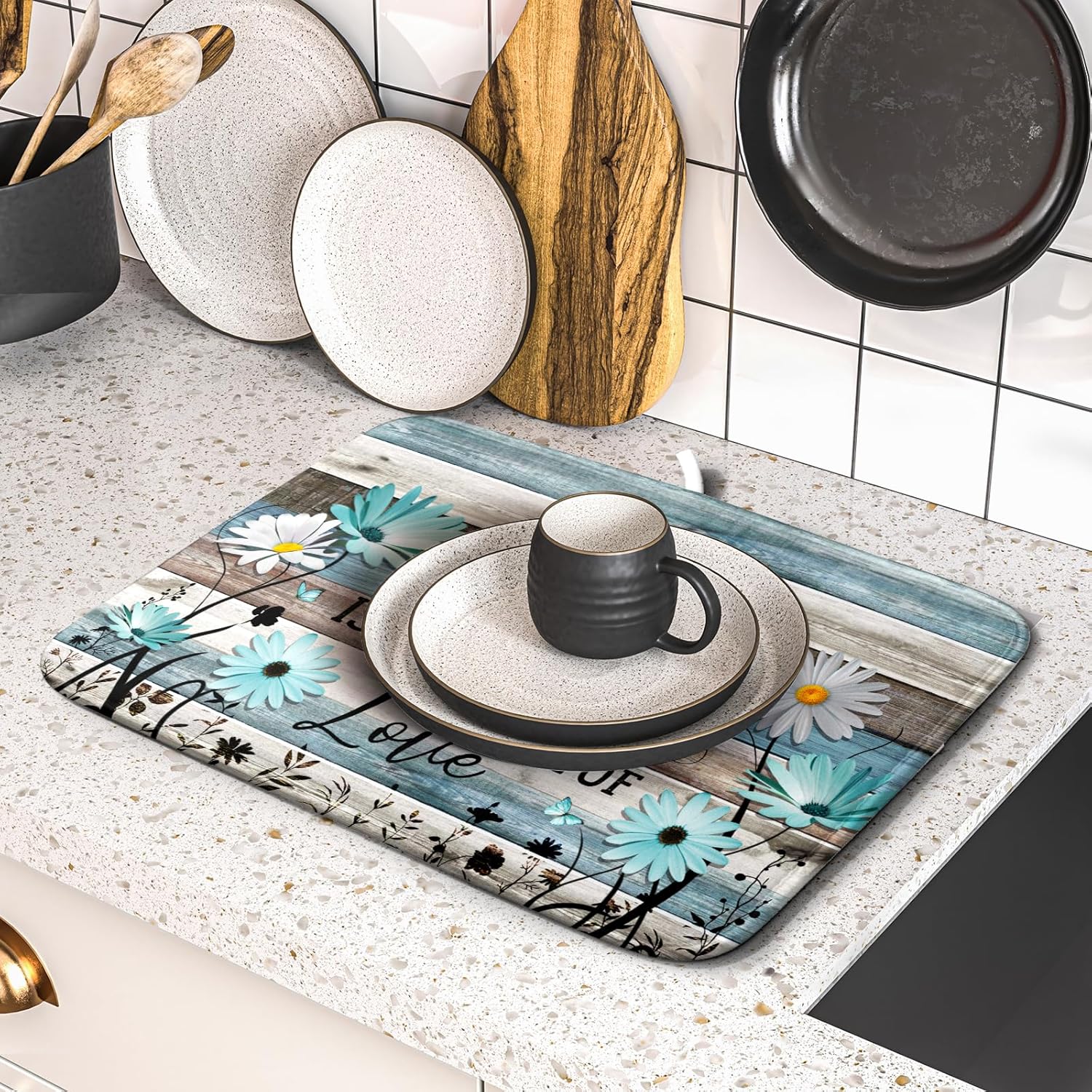 Daisy Floral Dish Drying Mat 16x18 Inches Rustic Wood Microfiber Absorbent Reversible Dish Draining Pad Fast Dry Kitchen Accessories
