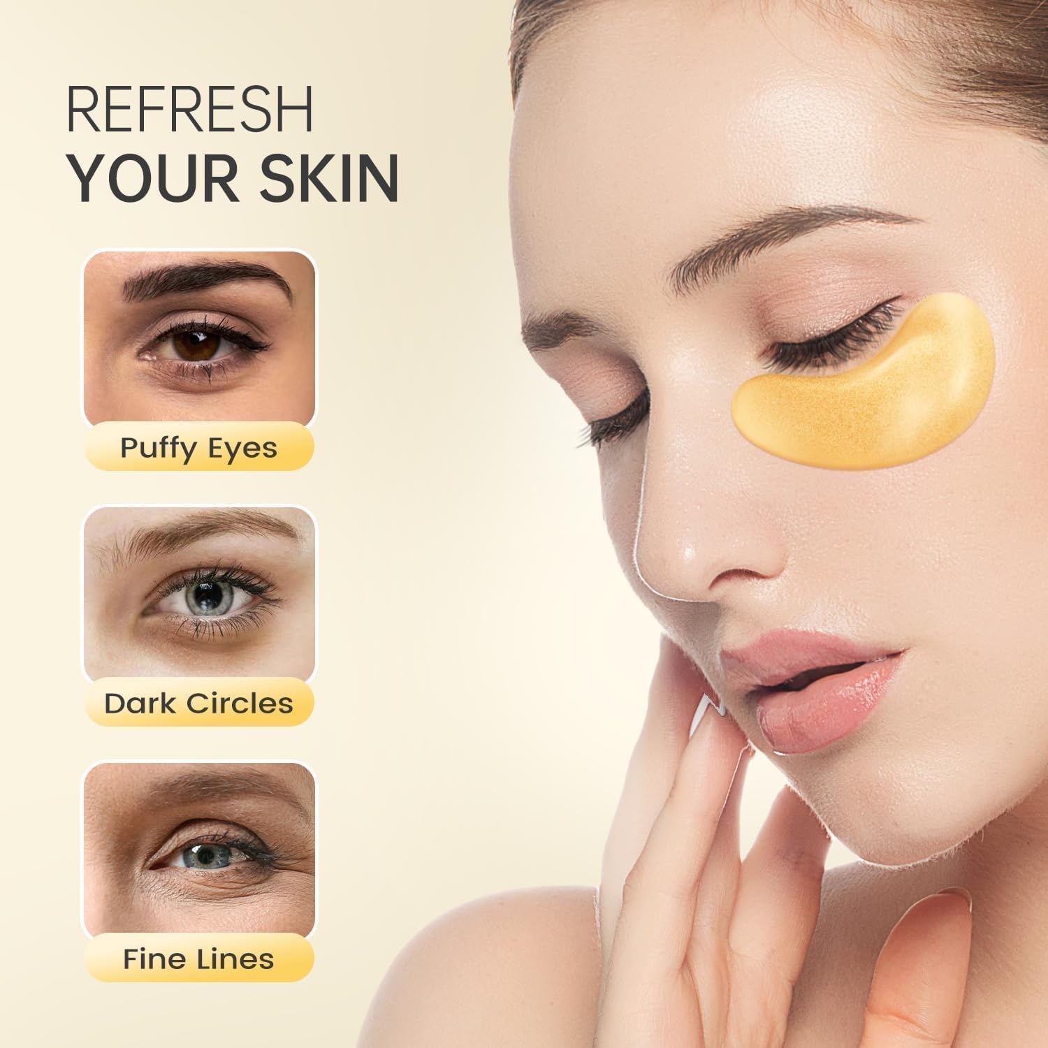 - [24K Gold Infused Brightening Treatment] Crafted with genuine 24K gold particles and vitamin C complex, our eye masks deliver instant radiance to tired under-eye areas. The gold-infused hydrogel conforms perfectly to eye contours, activating collagen production while reducing pigmentation. Ideal for daily use before makeup or post-long flights, see visible reduction in dark circles within 3 uses. Dermatologist-tested formula safe for sensitive skin. (Contains 60pcs/month supply)