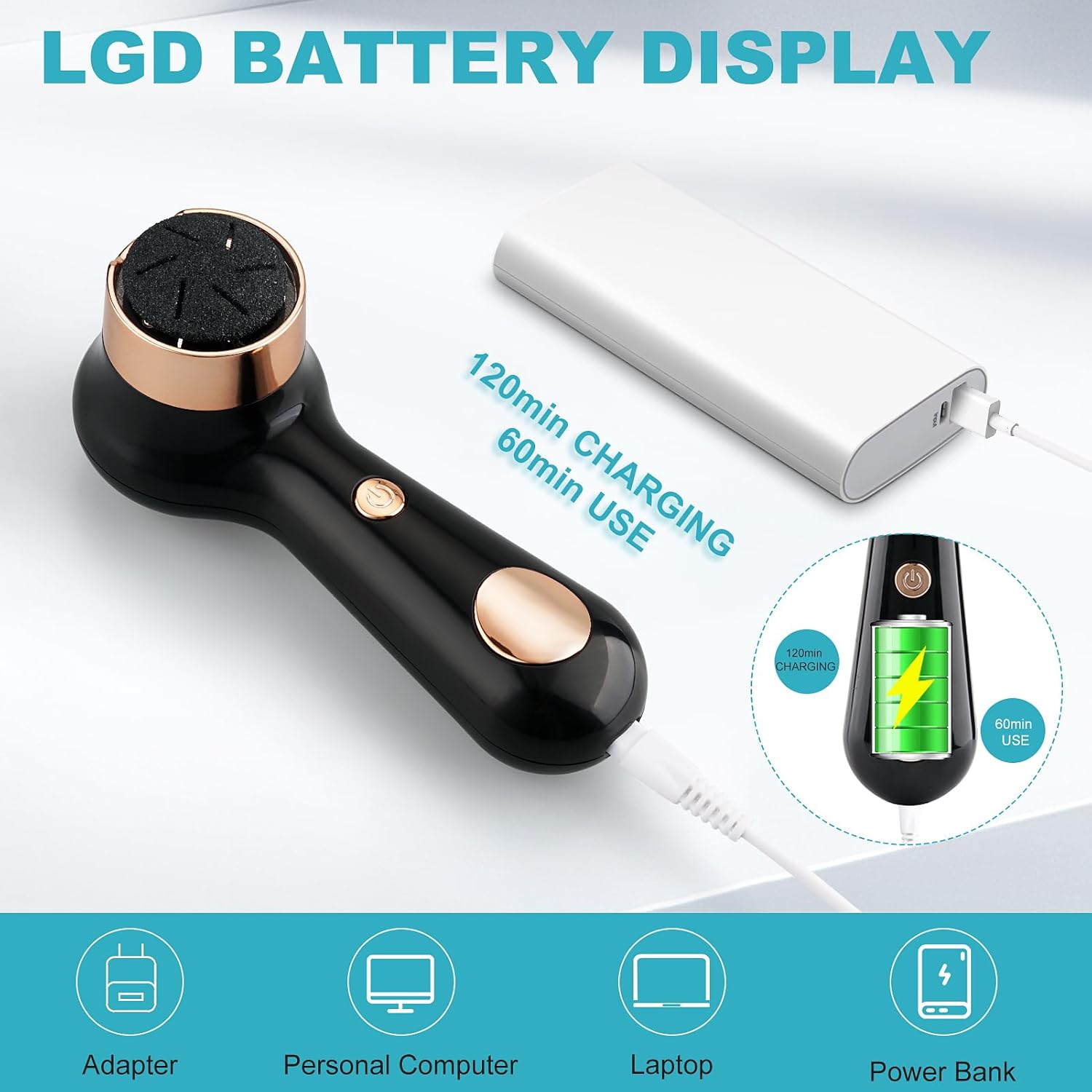 - 【Rechargeable & Long-Lasting】Electric foot grinder Equipped with a large-capacity lithium battery that lasts up to 60 minutes. The LED battery display shows remaining power, and it fully charges in just 2-3 hours with the included USB cable. Conveniently charge it with a laptop, power bank, or socket. Environmentally friendly – say goodbye to AA batteries!