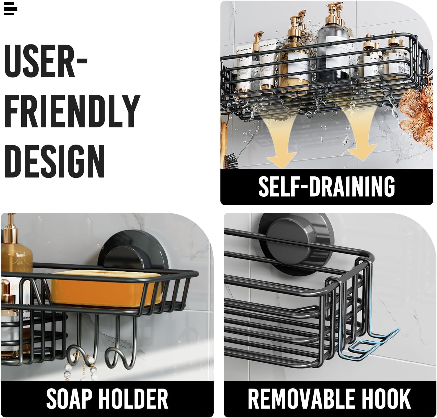 LEVERLOC Shower Caddy Suction Cup, 2 Pack suction shower shelf with Hooks & Soap holder, NO-Drilling Bathroom Holder, Rustproof bathroom organizer, Black