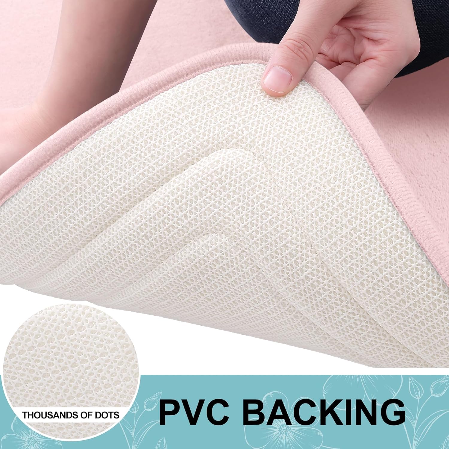 - [STABLE FOOTING] Our bathroom mat is equipped with a robust and enduring PVC backing, preventing shifting and skidding. Unlike mats with rubber backing that may wear off after washing, our bath mat ensures lasting durability. For a secure footing, keep the floor beneath the rug dry and avoid placing it on wet surfaces.