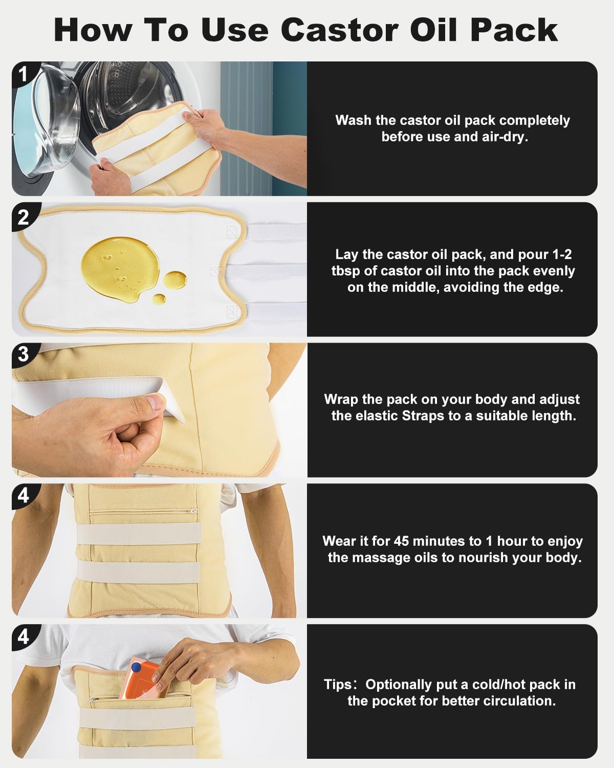 - 【How To Use】Wash thoroughly before use. Apply 1-2 tablespoons of castor oil evenly on the caster oil packs, wrap it to a suitable angle on the body, and wear it for 45-60 minutes or all night for better absorption by the body
