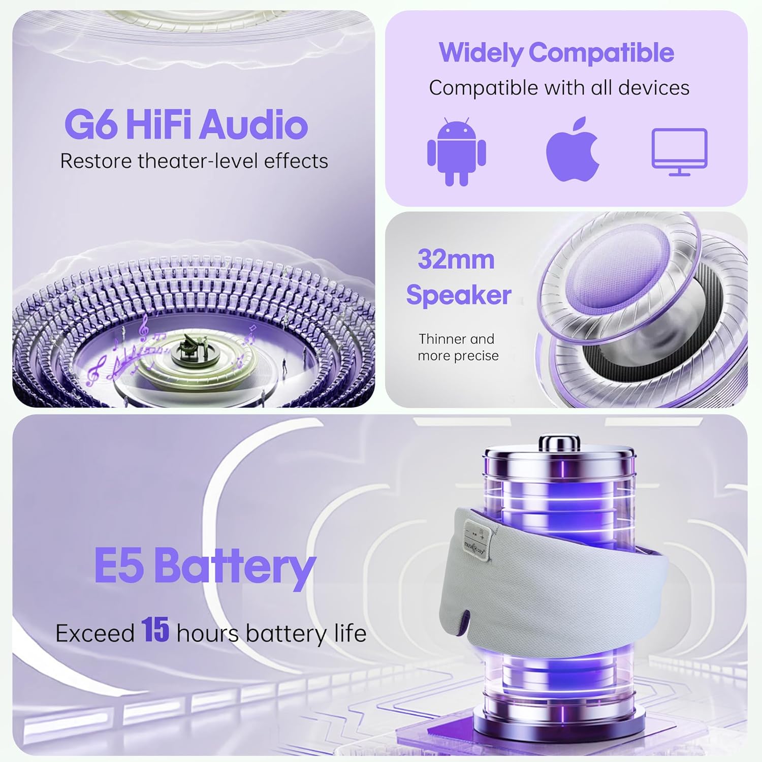 - Razor-Thin Bluetooth Sleep Mask: With musiCozy 5.4 Bluetooth Sleep Mask, featuring an integrated high-fidelity 32mm stereo headset and a battery life of up to 15 hours, this sleeping headphones seamlessly connects to any Bluetooth-enabled device. Enjoy the wireless convenience and customize your sleep experience with ease