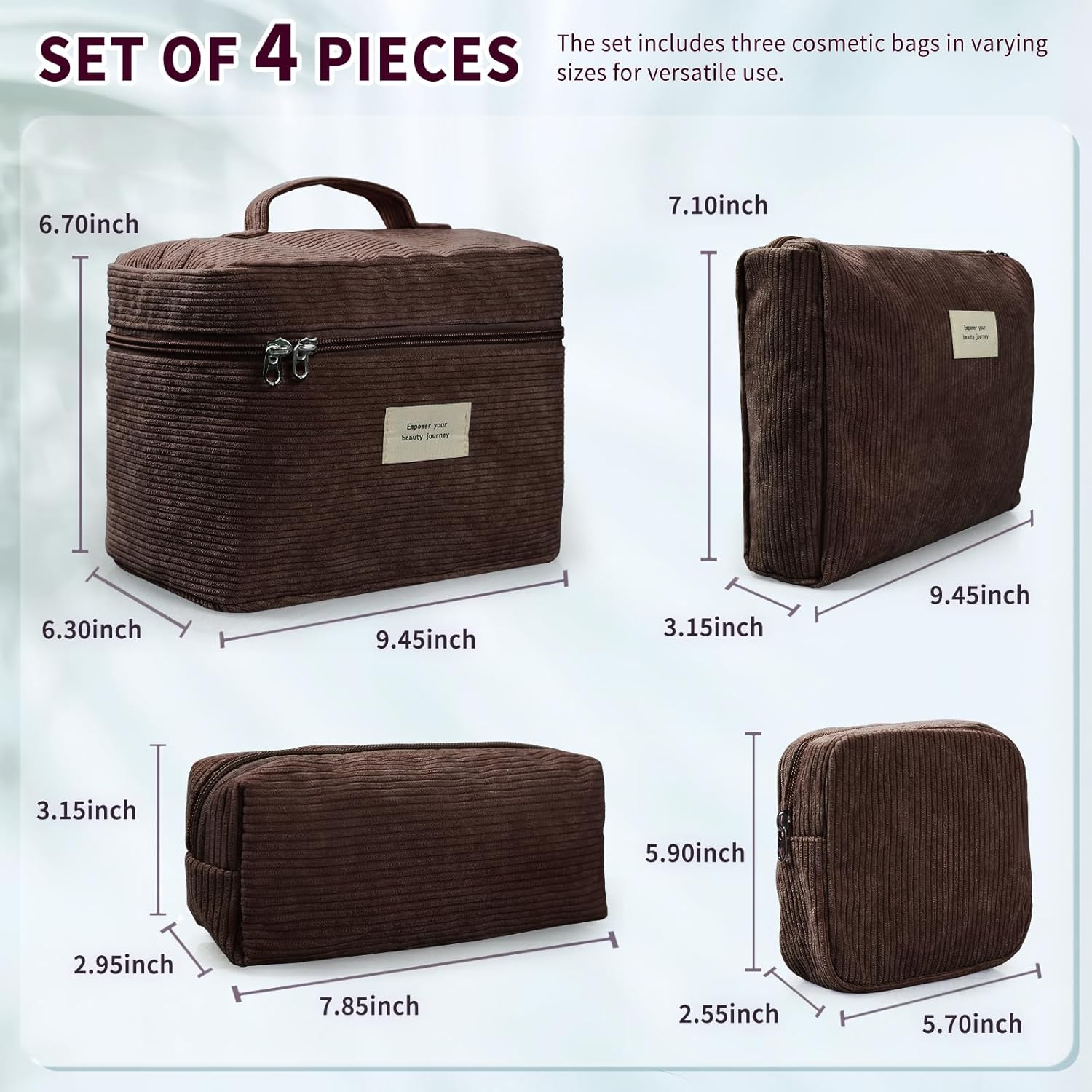 - This set includes four corduroy makeup bags, each with unique design and functionality. Sized at 9.45×6.30×6.70 inches, 9.45×3.15×7.10inches, 5.70×2.55×5.90inches,and 7.85×2.95×3.15 inches respectively, they are perfect for carrying along.