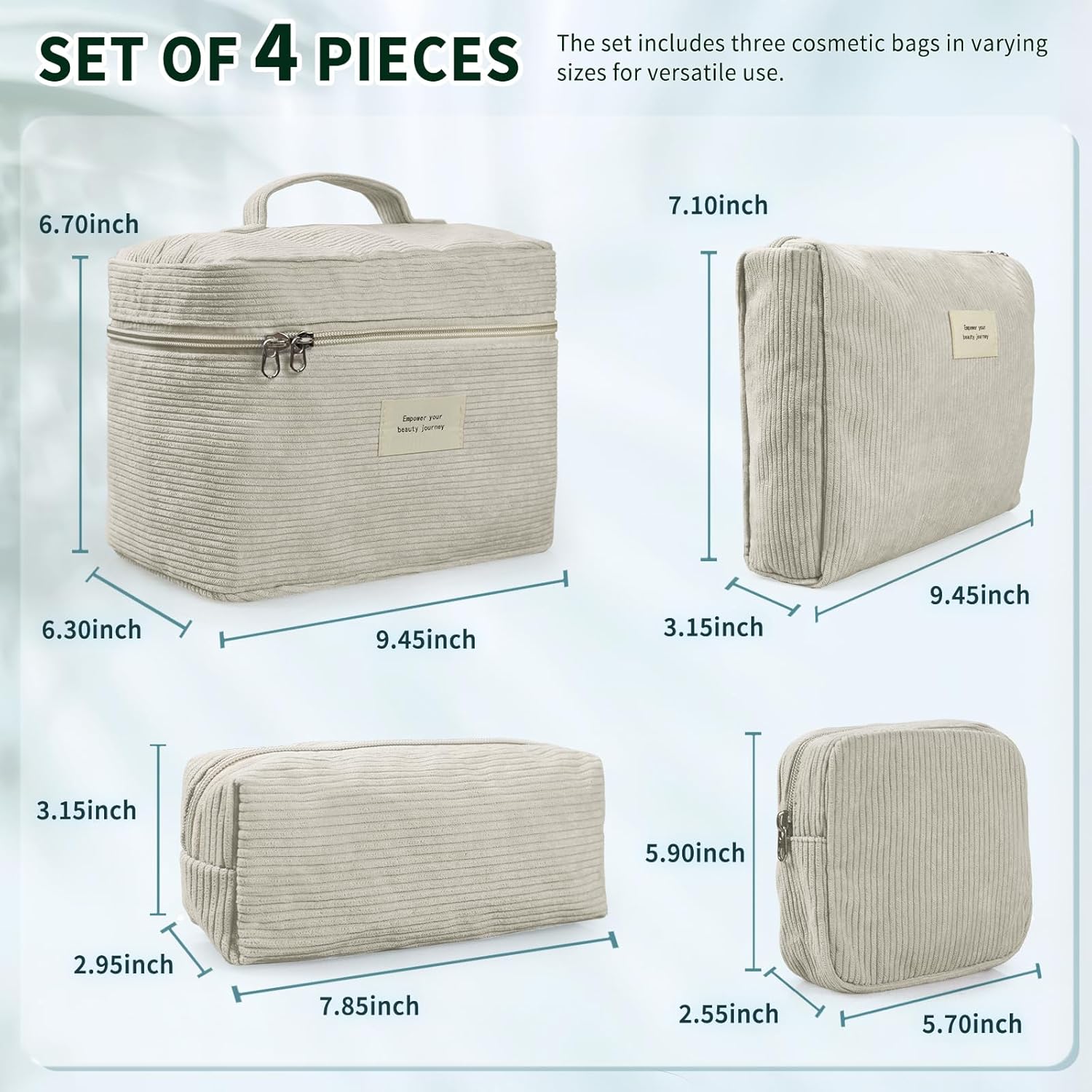 - This set includes four corduroy makeup bags, each with unique design and functionality. Sized at 9.45×6.30×6.70 inches, 9.45×3.15×7.10inches, 5.70×2.55×5.90inches,and 7.85×2.95×3.15 inches respectively, they are perfect for carrying along.