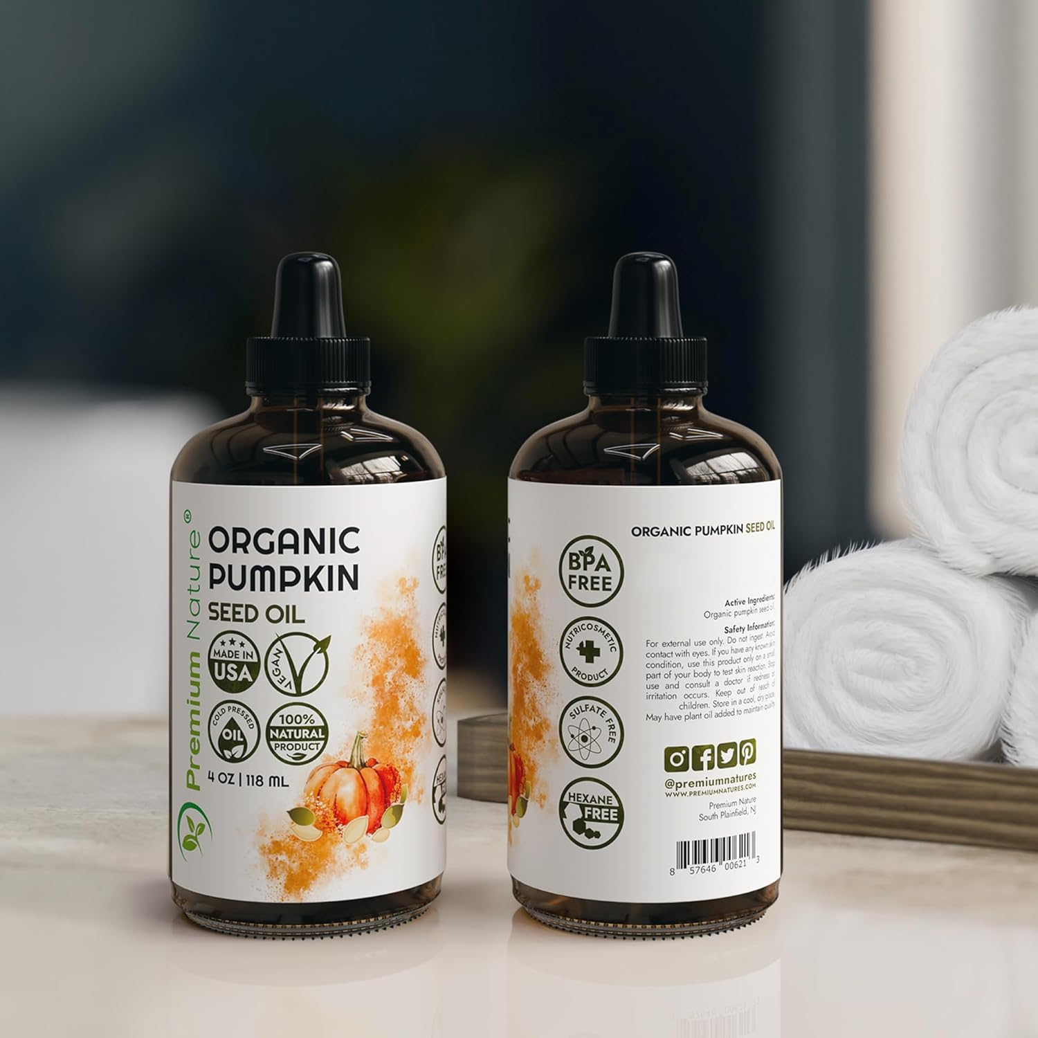 Organic Pumpkin Seed Oil Cold-Pressed Unrefined from Premium Nature, 100% Pumpkin Seed Oil for Hair Growth Pure Pumpkin Oil for Skin and Face Hair Oil Aceite de semilla de calabaza para el cabello 4oz