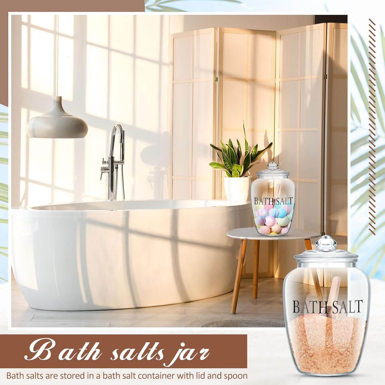 - Distinctive Craftsmanship: crafted with glass and equipped with a wooden scoop, the 2 sets of bath salts glass jars don't just satisfy your storage needs, they add a touch of classic and rustic to your bathroom or kitchen decoration; Their size of about 9.65 x 5.91 inches with a capacity of about 74 oz offers ample space to store bath salts or even laundry soap