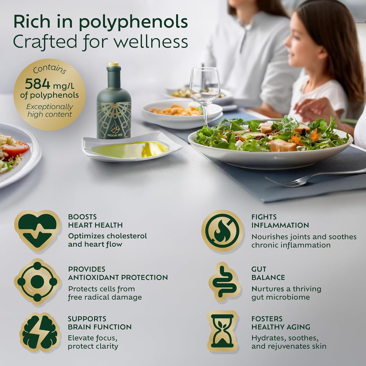 NOOR FÈS 20+ Awards EVOO | Polyphenol Rich 584 mg/kg | USDA Organic Extra Virgin Olive Oil | Moroccan Picholine | Cold Pressed Olive Oil | Great Gift for Chefs | 17 Oz