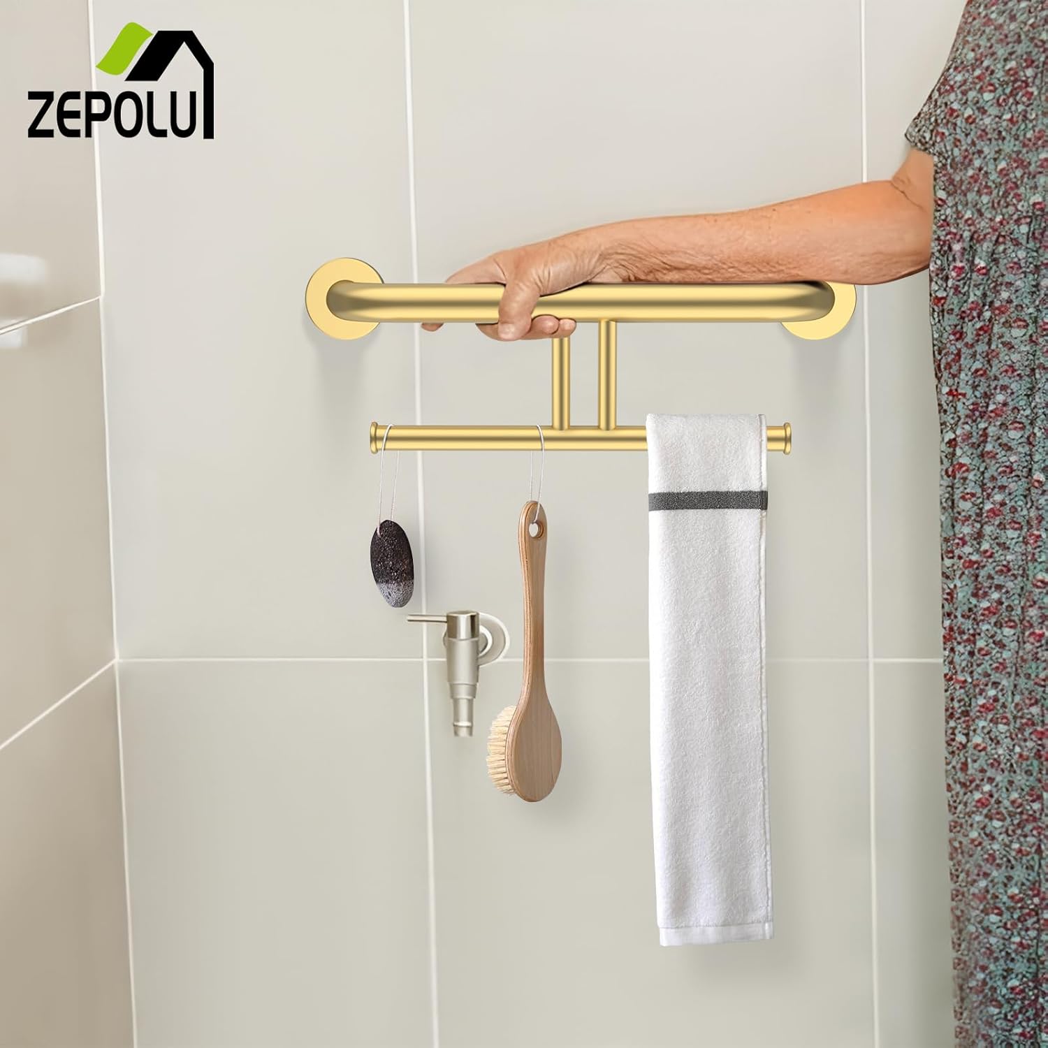 - Durable&Stay Safe in the Toilet: Zepolu gold grab bar with integrated paper holder is built to last. It is resistant to rust, corrosion, and tarnish, ensuring a long-lasting and dependable grip. Gold toilet grab bar 17 inch provides sturdy balance support for seniors and those with mobility issues, holds up to 500 lbs.
