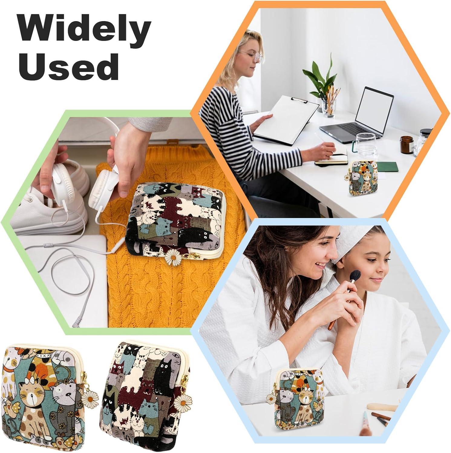 cobee 2PCS Sanitary Pad Storage Bag, Cute Sanitary Napkin Storage Purses Portable Period Bag with Daisy Zipper Panty Liner Tampon Menstrual Cup Nursing Pad Holder Pouch for Girls Women Travel(Cat)