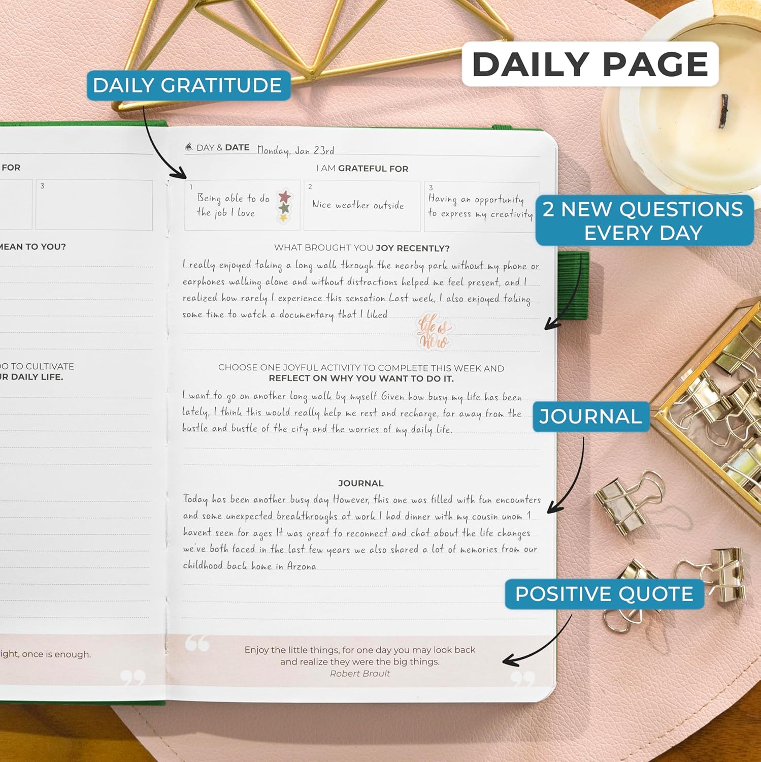 - DELVE DEEPER WITH NEW QUESTIONS DAILY – Each day, the positive journal offers a unique question and a reflection prompt to explore different areas of your life and find new, meaningful ways to cultivate happiness and reduce stress and negativity.