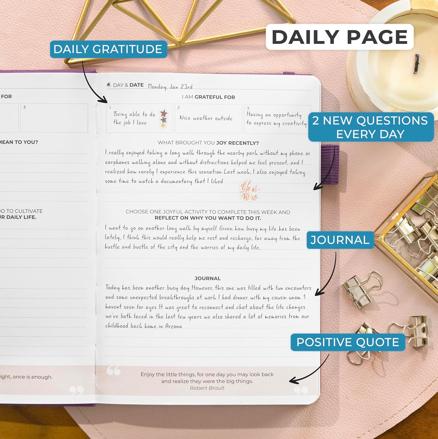 - DELVE DEEPER WITH NEW QUESTIONS DAILY – Each day, the positive journal offers a unique question and a reflection prompt to explore different areas of your life and find new, meaningful ways to cultivate happiness and reduce stress and negativity.