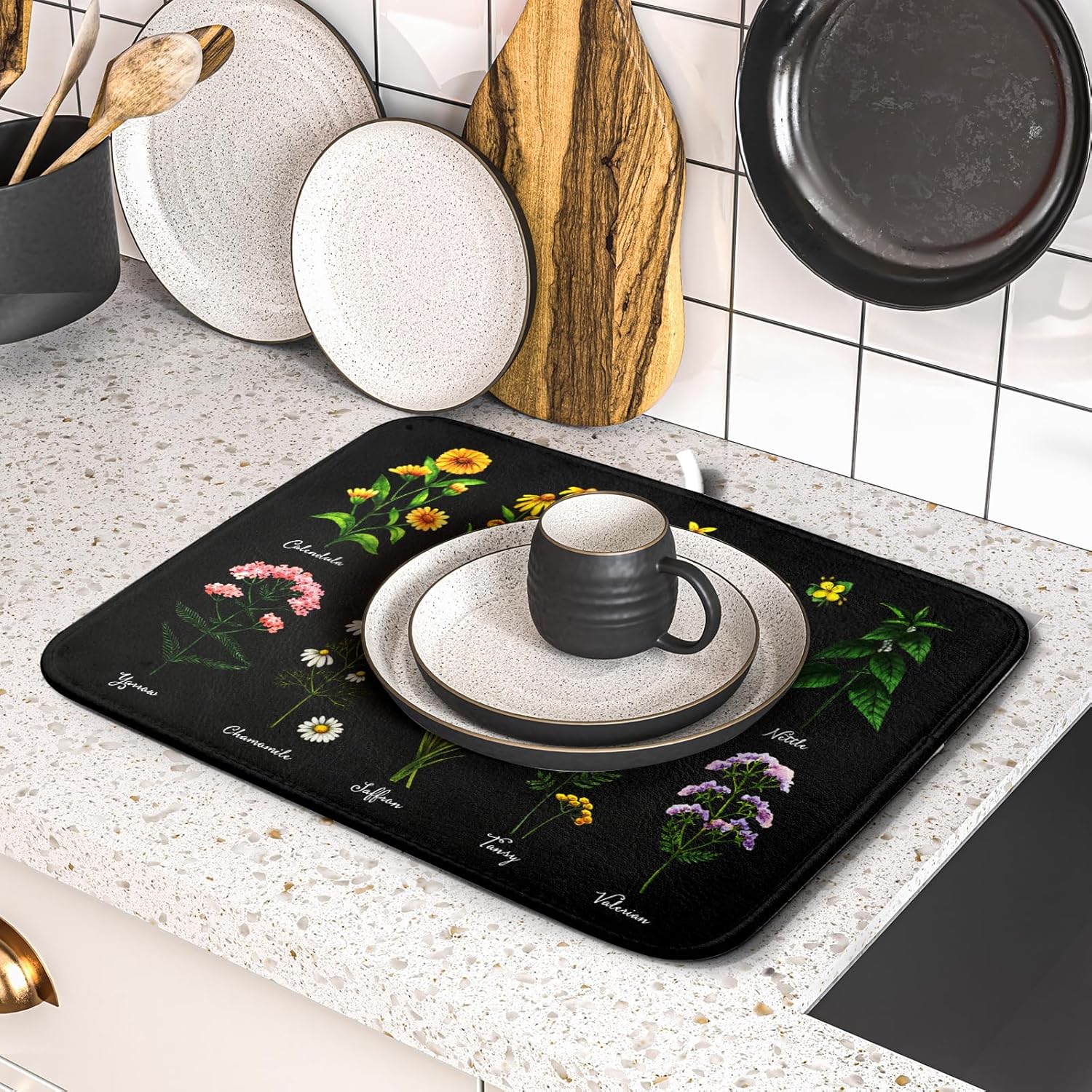 Black Flower Herbs Dish Drying Mat 16x18 Inch Botanical Floral Microfiber Drying Mats with Hanging Loop Foldable Absorbent Dish Drainer Rack Pad