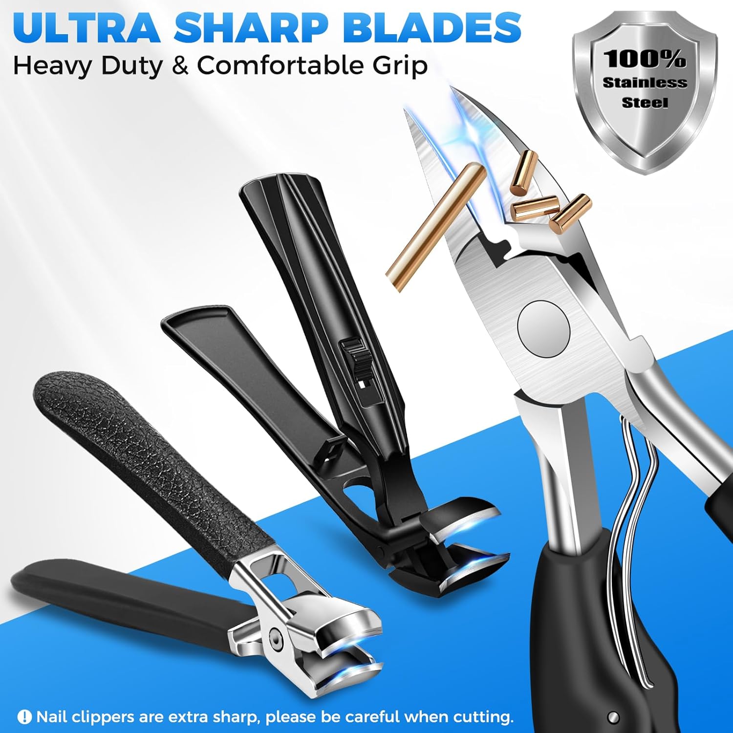 - 5-IN-1 MENS NAIL CLIPPERS SET - This nail clipper set for men contains 1 x Ingrown Toenail Clippers for Thick Toenails, 1 x Angled Nail Clippers for Seniors, 1 x Mess Free Nail Clippers with Catcher, 1 x Toenail Lifter, 1 x Cuticle Pusher. Made of premium stainless steel, nail clippers for men are waterproof and rustproof, sturdy and long-lasting. The blade is repeatedly ground and polished to make it fits better and sharper without jaggies.