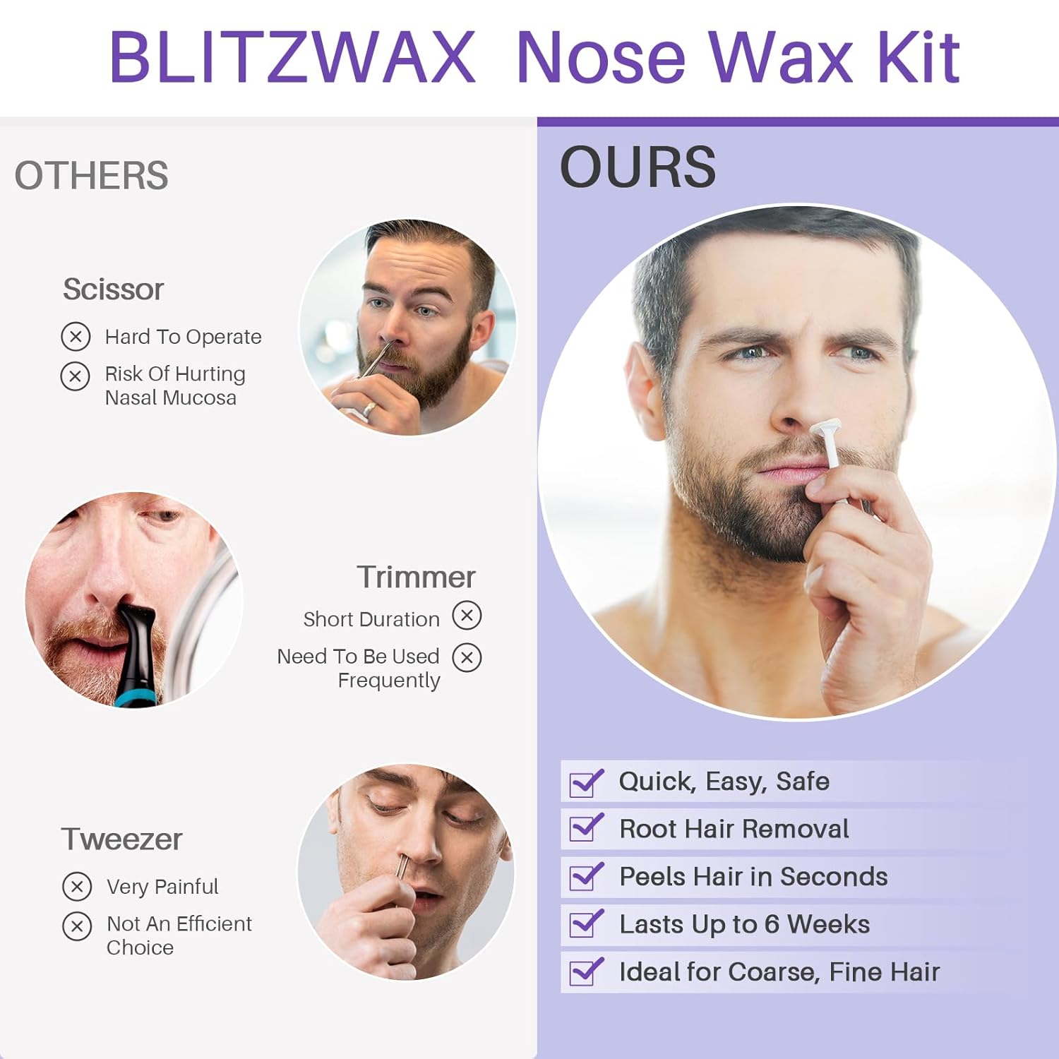- ๐ ๐๐๐ฌ๐๐ฅ ๐๐๐ข๐ซ ๐๐๐ฆ๐จ๐ฏ๐๐ฅ: Designed specifically for nasal hair, these nose wax applicators target visible long hairs while preserving essential deep nasal hair. They enhance breathing and maintain nasal hygiene comfortably and efficiently