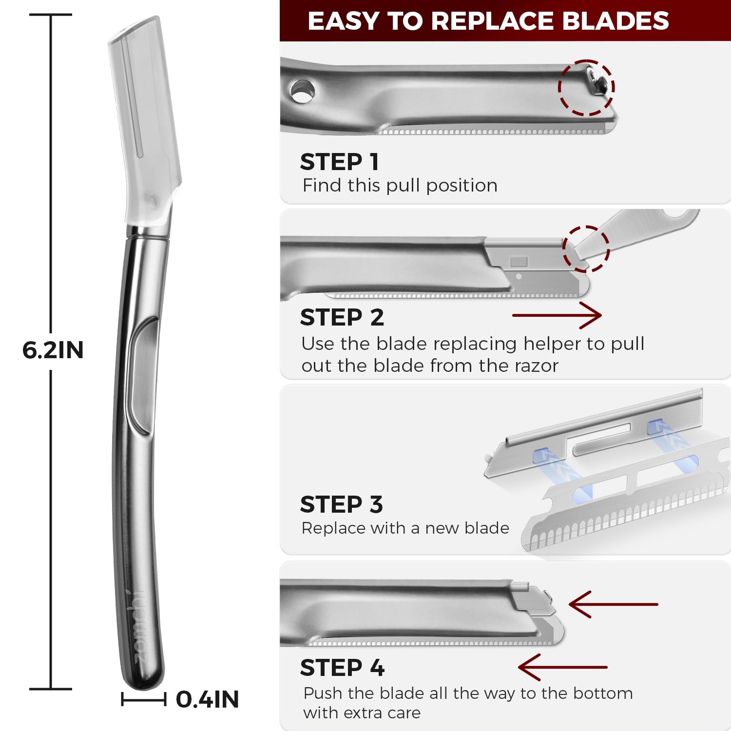 - 11PCS SHARP BLADES: Designed to last, a zero-waste at-home eyebrow razor for removing both coarse and fine hair on the face, shaping brows, and exfoliating skin with an Earth-friendly footprint. The set includes 11x stainless sharp blades help to extend the use time. It's recommended to change the blade every 3 to 4 weeks.